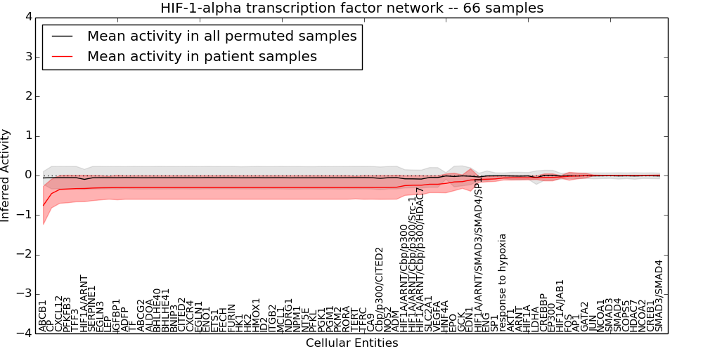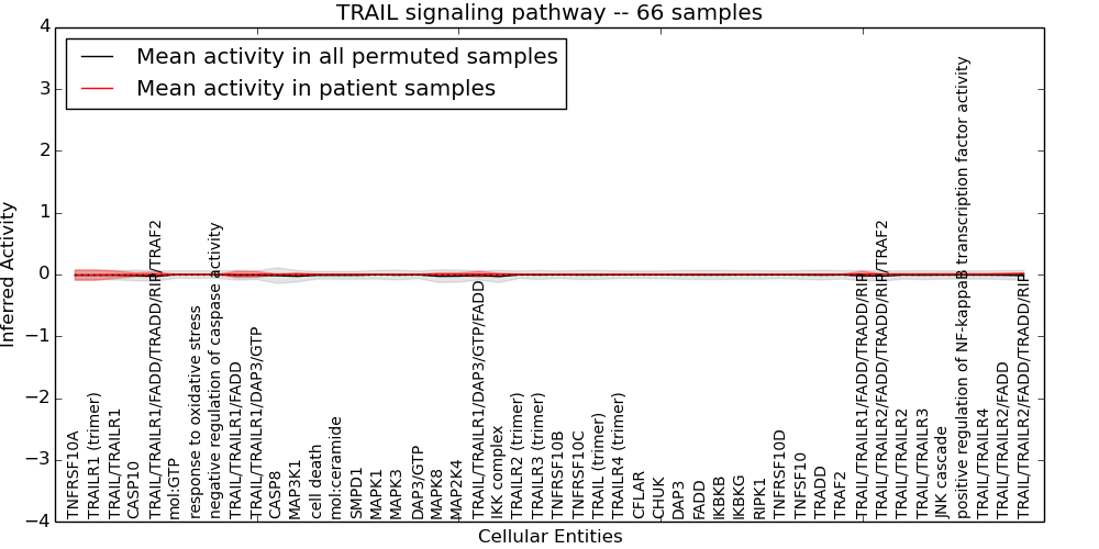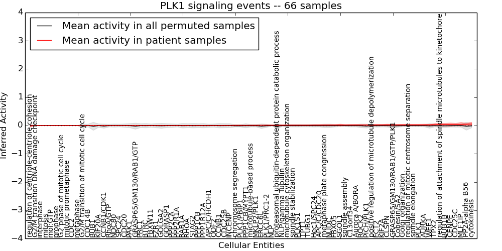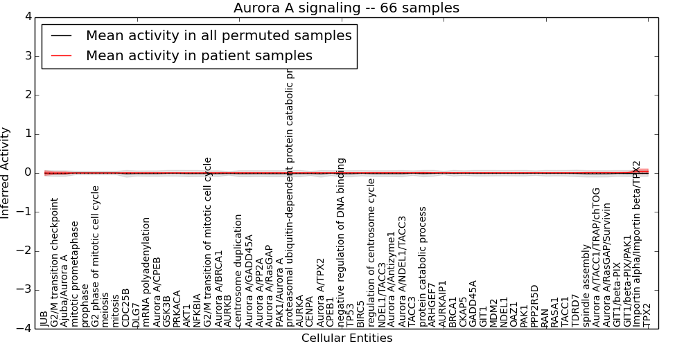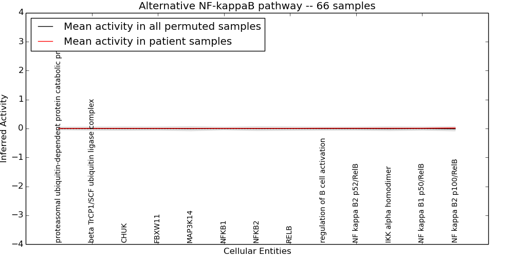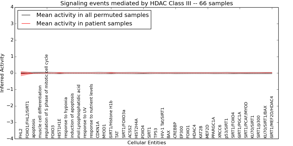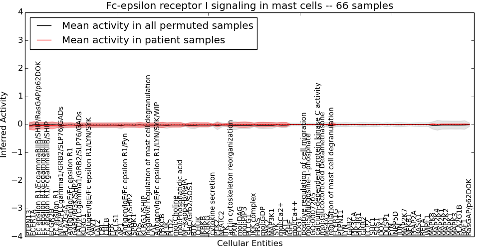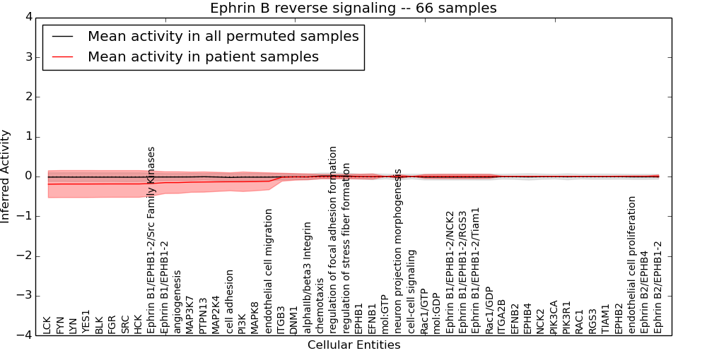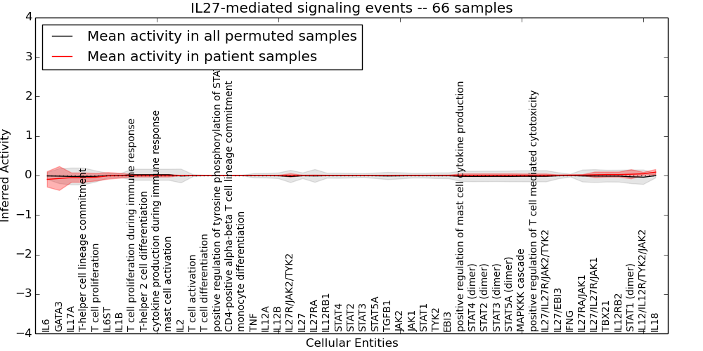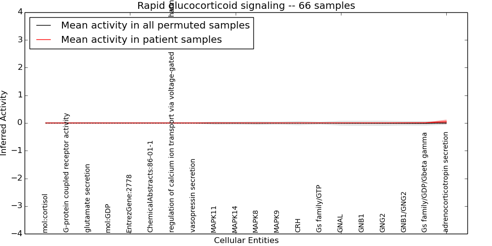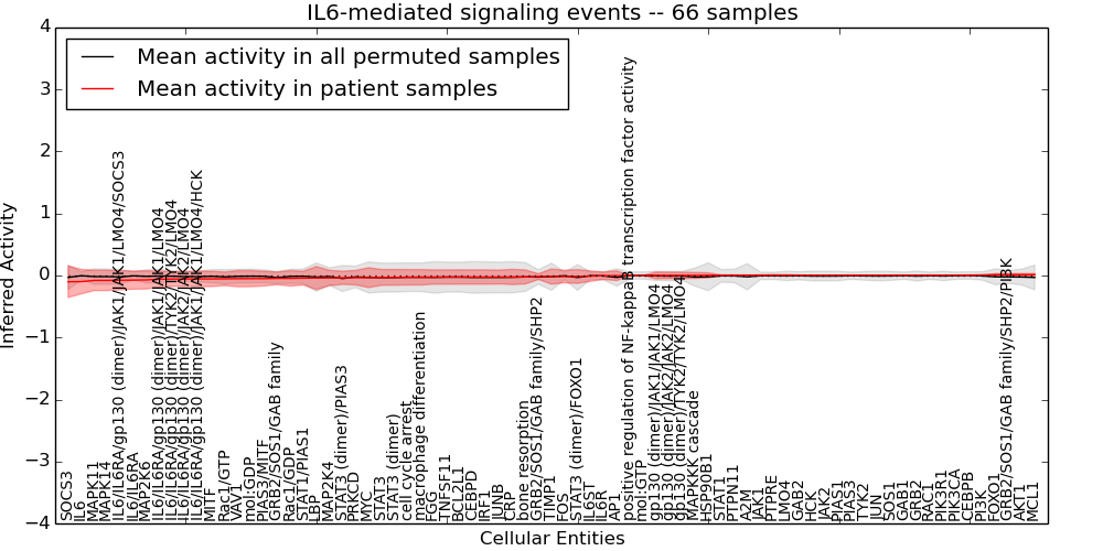 Figure S125.  Get High-res Image This plot shows pathway concept perturbations across all samples against a permutation model. The concepts along the x-axis are sorted by lowest to highest mean activity for the real patient samples. Mean inferred activities are plotted along the y-axis as a colored band showing the average level and one standard deviation range. Real samples are shown in red and permuted samples in black.