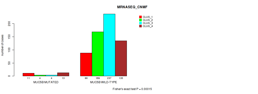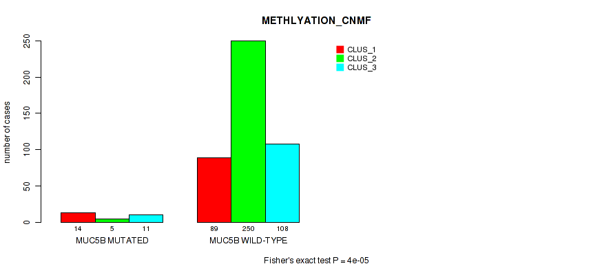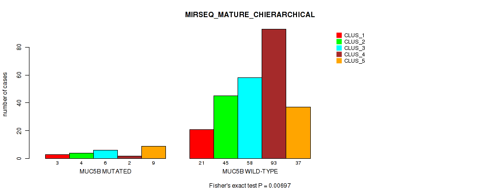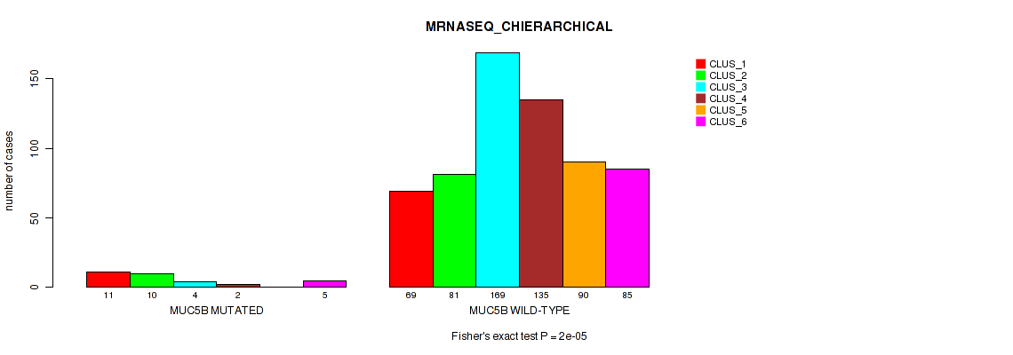 MUC5B mutation correlated to 'CN_CNMF', 'METHLYATION_CNMF', 'RPPA_CHIERARCHICAL', 'MRNASEQ_CNMF', 'MRNASEQ_CHIERARCHICAL', 'MIRSEQ_CNMF', 'MIRSEQ_CHIERARCHICAL', 'MIRSEQ_MATURE_CNMF', and 'MIRSEQ_MATURE_CHIERARCHICAL'.
