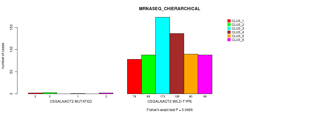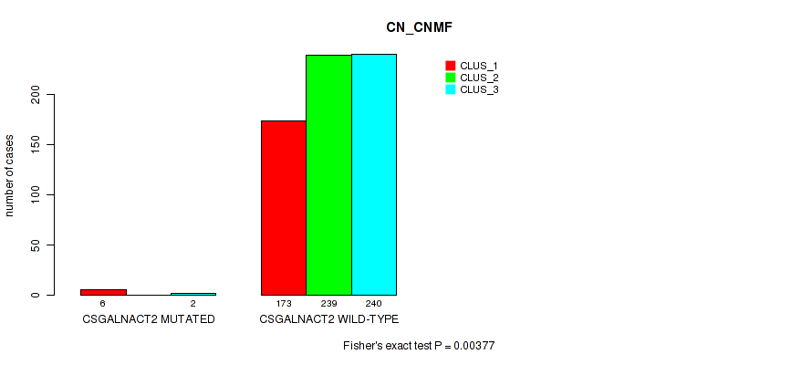 CSGALNACT2 mutation correlated to 'CN_CNMF', 'MRNASEQ_CNMF', 'MRNASEQ_CHIERARCHICAL', 'MIRSEQ_CNMF', and 'MIRSEQ_CHIERARCHICAL'.