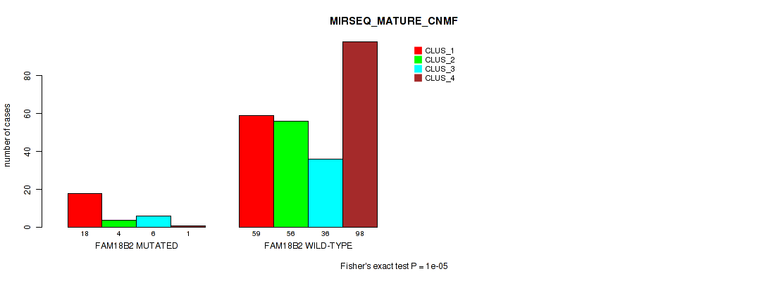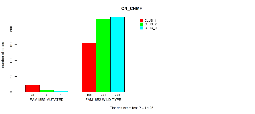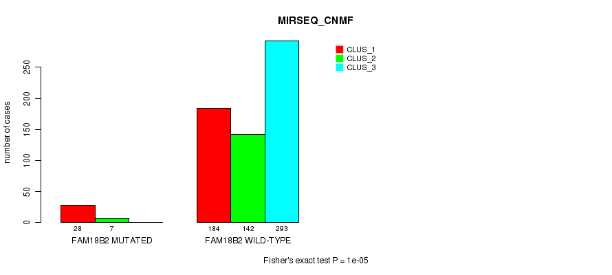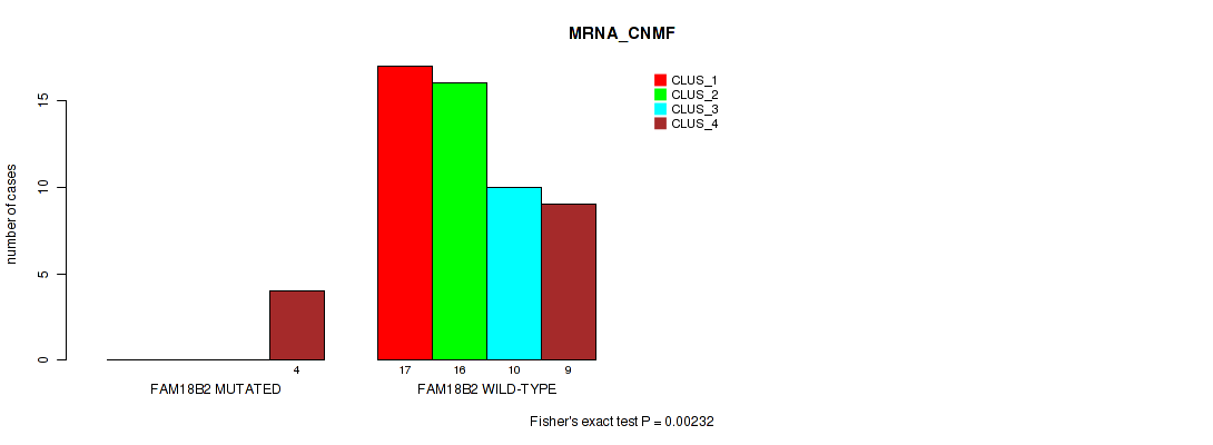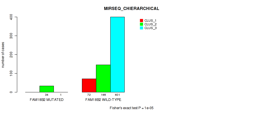 FAM18B2 mutation correlated to 'MRNA_CNMF', 'MRNA_CHIERARCHICAL', 'CN_CNMF', 'METHLYATION_CNMF', 'MRNASEQ_CNMF', 'MRNASEQ_CHIERARCHICAL', 'MIRSEQ_CNMF', 'MIRSEQ_CHIERARCHICAL', 'MIRSEQ_MATURE_CNMF', and 'MIRSEQ_MATURE_CHIERARCHICAL'.