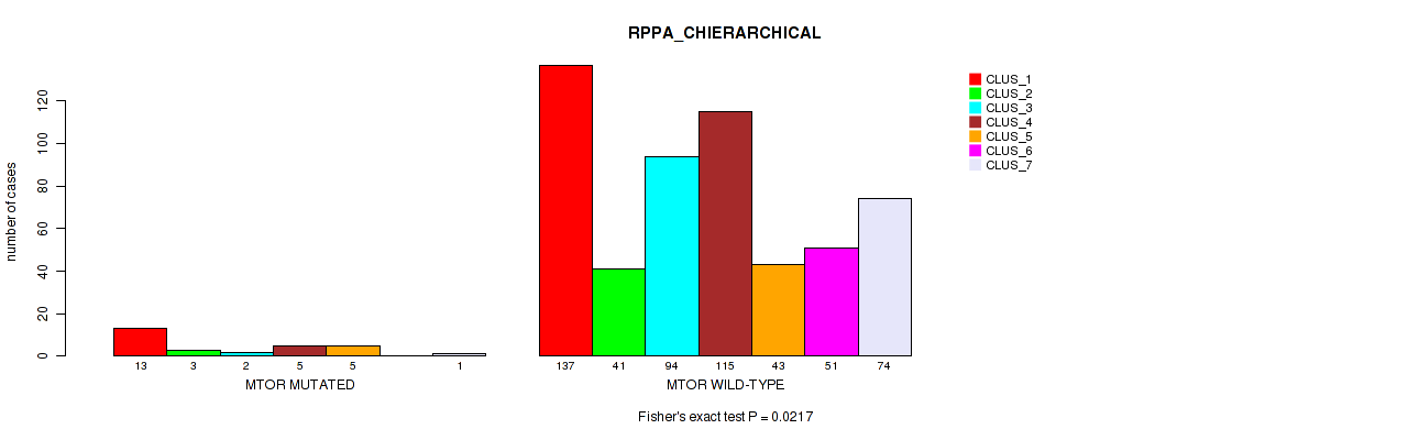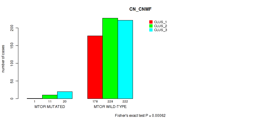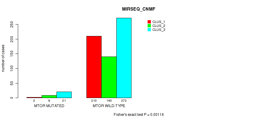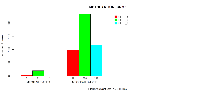 MTOR mutation correlated to 'CN_CNMF', 'METHLYATION_CNMF', 'RPPA_CNMF', 'RPPA_CHIERARCHICAL', 'MIRSEQ_CNMF', and 'MIRSEQ_CHIERARCHICAL'.