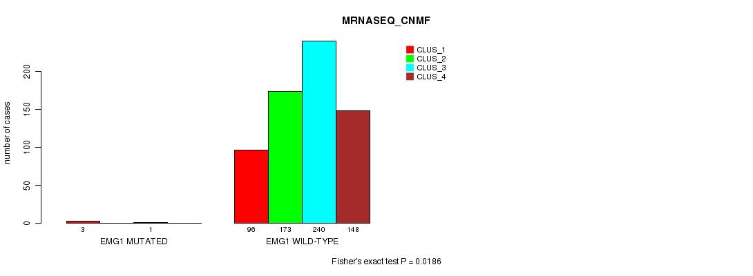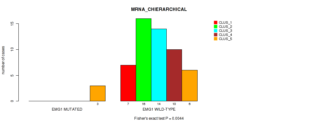 EMG1 mutation correlated to 'MRNA_CNMF', 'MRNA_CHIERARCHICAL', 'MRNASEQ_CNMF', 'MRNASEQ_CHIERARCHICAL', and 'MIRSEQ_CHIERARCHICAL'.