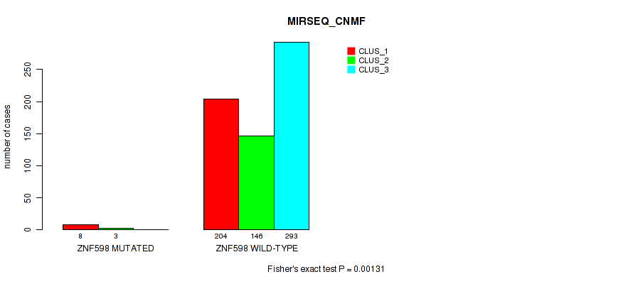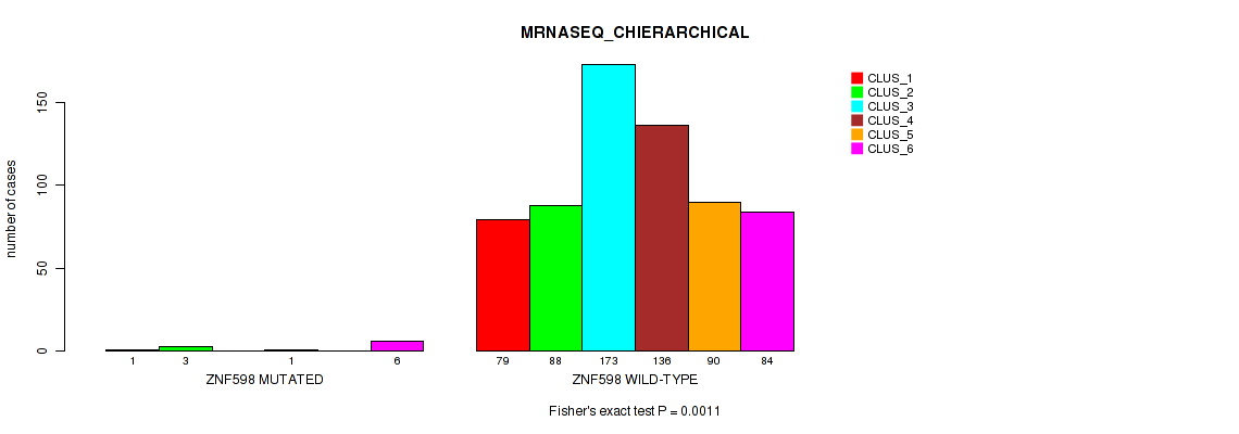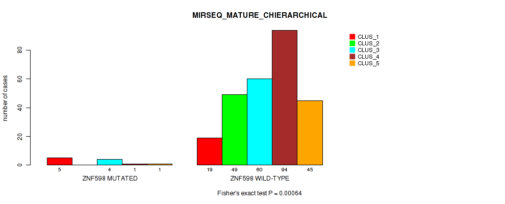 ZNF598 mutation correlated to 'CN_CNMF', 'METHLYATION_CNMF', 'MRNASEQ_CNMF', 'MRNASEQ_CHIERARCHICAL', 'MIRSEQ_CNMF', 'MIRSEQ_CHIERARCHICAL', and 'MIRSEQ_MATURE_CHIERARCHICAL'.