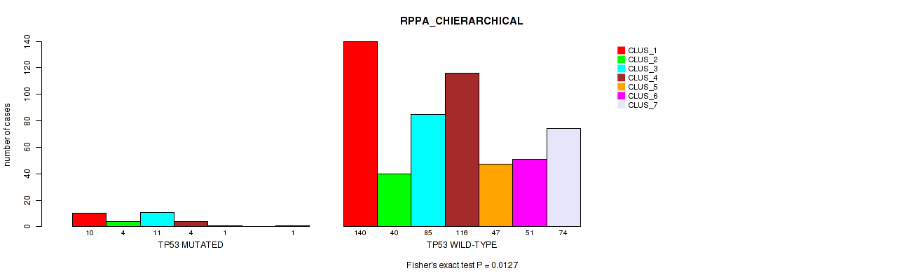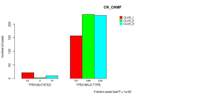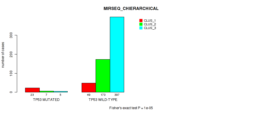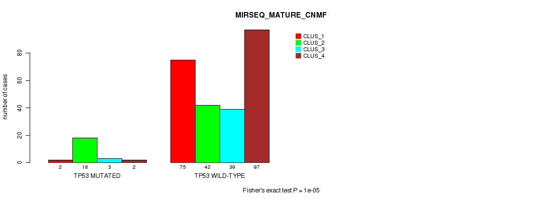 TP53 mutation correlated to 'CN_CNMF', 'METHLYATION_CNMF', 'RPPA_CHIERARCHICAL', 'MRNASEQ_CNMF', 'MRNASEQ_CHIERARCHICAL', 'MIRSEQ_CNMF', 'MIRSEQ_CHIERARCHICAL', 'MIRSEQ_MATURE_CNMF', and 'MIRSEQ_MATURE_CHIERARCHICAL'.