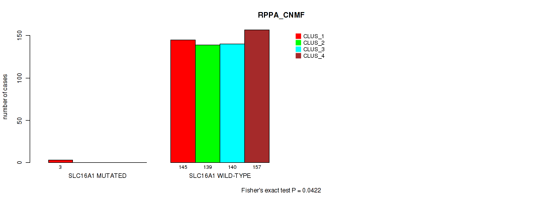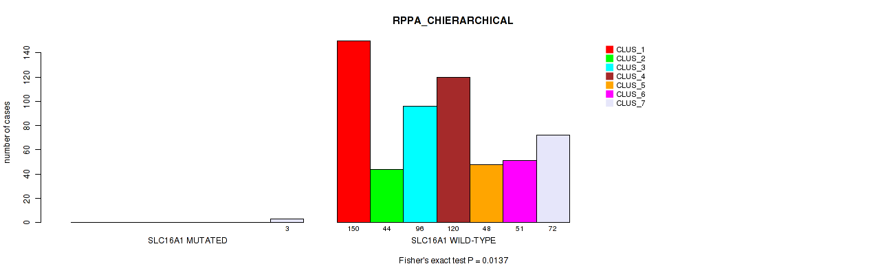 SLC16A1 mutation correlated to 'RPPA_CNMF' and 'RPPA_CHIERARCHICAL'.