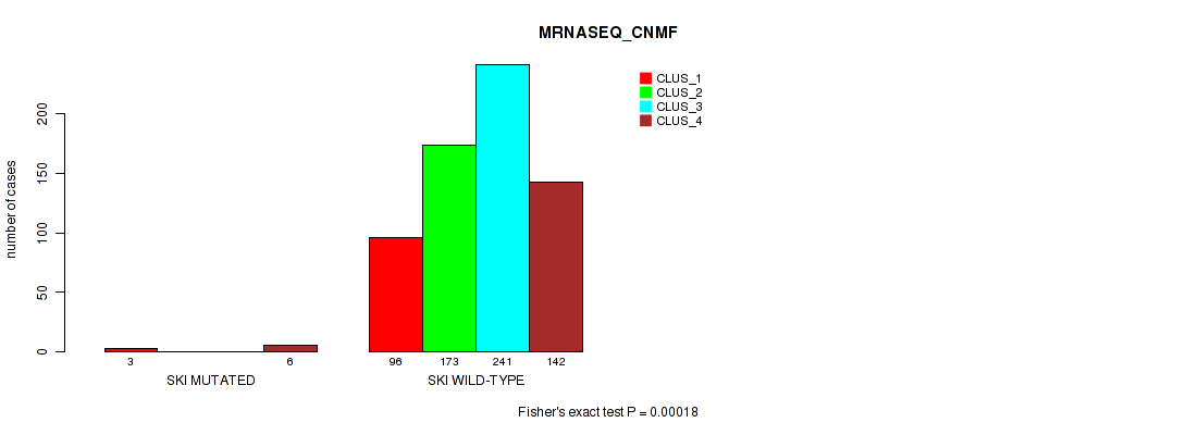 SKI mutation correlated to 'CN_CNMF', 'MRNASEQ_CNMF', 'MRNASEQ_CHIERARCHICAL', 'MIRSEQ_CNMF', 'MIRSEQ_CHIERARCHICAL', and 'MIRSEQ_MATURE_CNMF'.