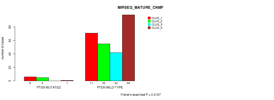 PTEN mutation correlated to 'MRNASEQ_CNMF', 'MRNASEQ_CHIERARCHICAL', 'MIRSEQ_MATURE_CNMF', and 'MIRSEQ_MATURE_CHIERARCHICAL'.