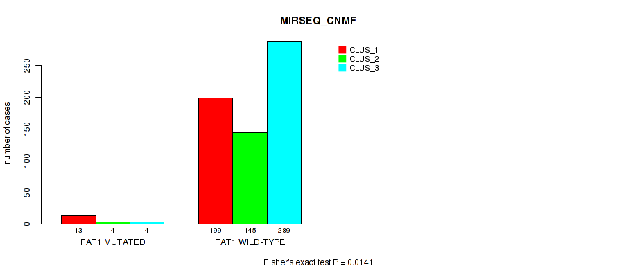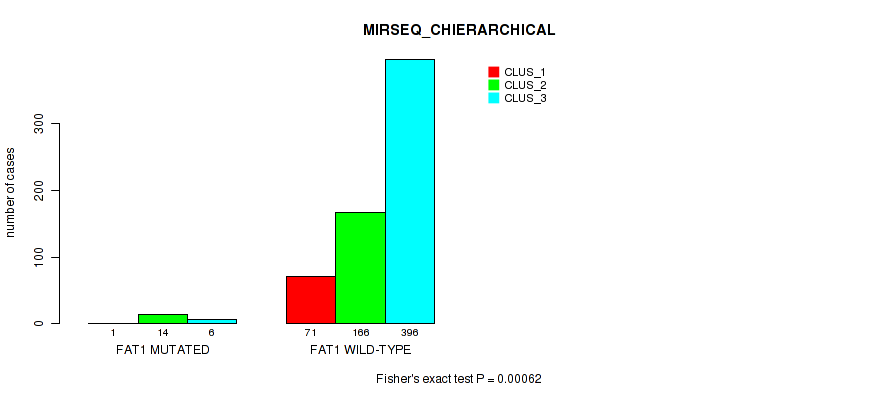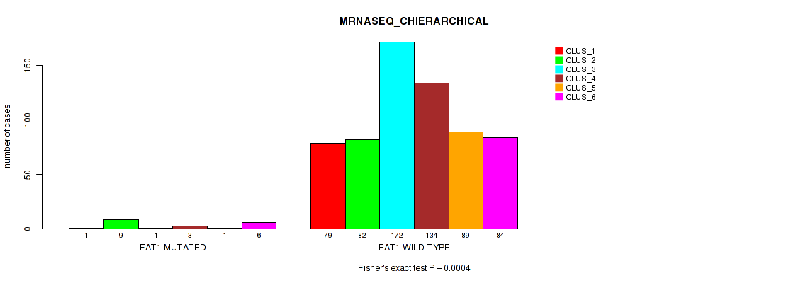 FAT1 mutation correlated to 'METHLYATION_CNMF', 'MRNASEQ_CNMF', 'MRNASEQ_CHIERARCHICAL', 'MIRSEQ_CNMF', and 'MIRSEQ_CHIERARCHICAL'.