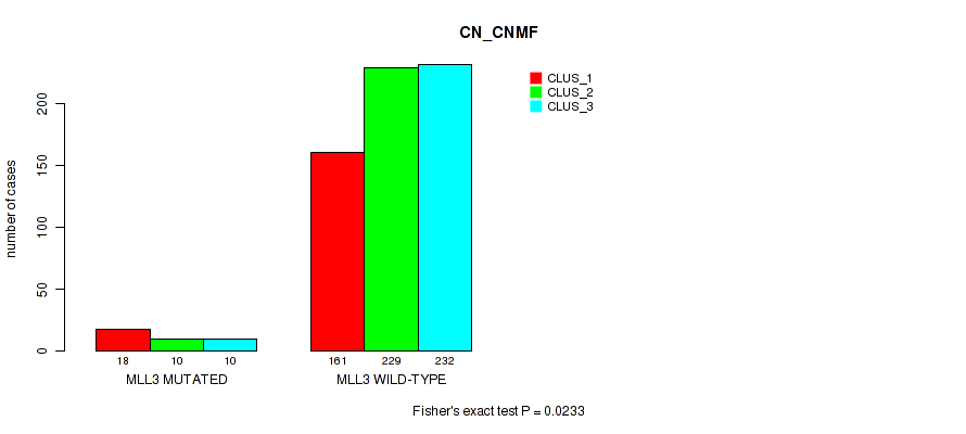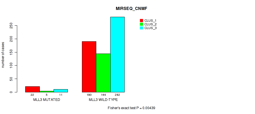 MLL3 mutation correlated to 'CN_CNMF', 'METHLYATION_CNMF', 'MRNASEQ_CNMF', 'MRNASEQ_CHIERARCHICAL', 'MIRSEQ_CNMF', and 'MIRSEQ_CHIERARCHICAL'.
