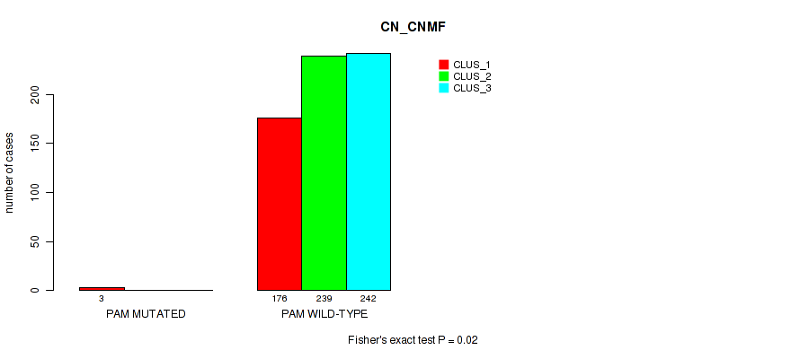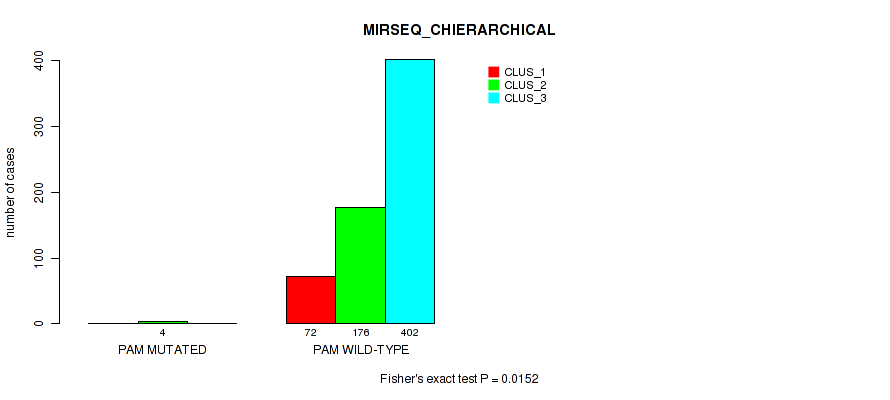PAM mutation correlated to 'CN_CNMF', 'METHLYATION_CNMF', 'MRNASEQ_CNMF', 'MRNASEQ_CHIERARCHICAL', 'MIRSEQ_CNMF', and 'MIRSEQ_CHIERARCHICAL'.