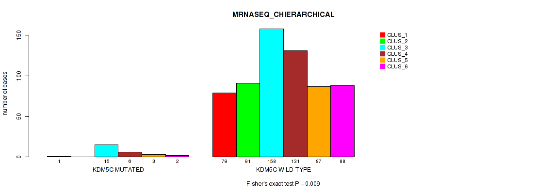 KDM5C mutation correlated to 'METHLYATION_CNMF', 'MRNASEQ_CNMF', 'MRNASEQ_CHIERARCHICAL', 'MIRSEQ_CNMF', and 'MIRSEQ_CHIERARCHICAL'.