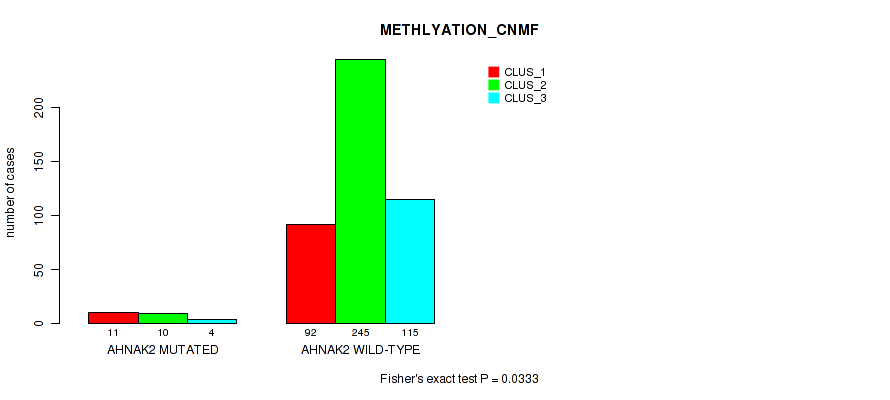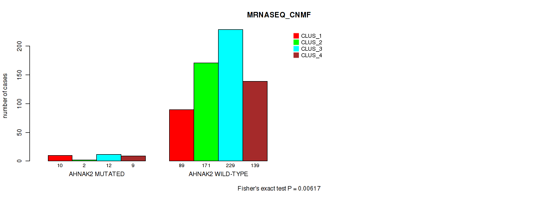 AHNAK2 mutation correlated to 'METHLYATION_CNMF', 'MRNASEQ_CNMF', 'MRNASEQ_CHIERARCHICAL', 'MIRSEQ_CNMF', and 'MIRSEQ_CHIERARCHICAL'.