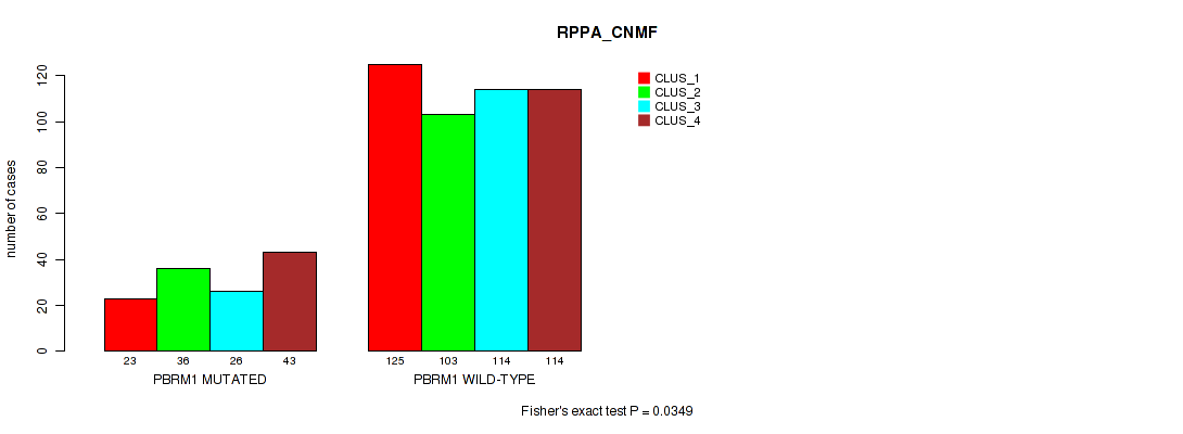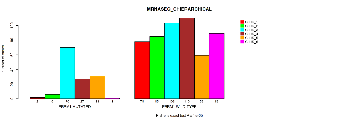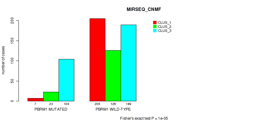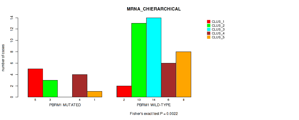 PBRM1 mutation correlated to 'MRNA_CNMF', 'MRNA_CHIERARCHICAL', 'CN_CNMF', 'METHLYATION_CNMF', 'RPPA_CNMF', 'RPPA_CHIERARCHICAL', 'MRNASEQ_CNMF', 'MRNASEQ_CHIERARCHICAL', 'MIRSEQ_CNMF', 'MIRSEQ_CHIERARCHICAL', 'MIRSEQ_MATURE_CNMF', and 'MIRSEQ_MATURE_CHIERARCHICAL'.