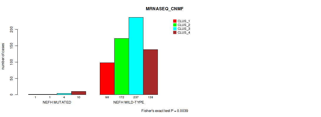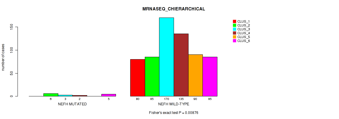 NEFH mutation correlated to 'METHLYATION_CNMF', 'MRNASEQ_CNMF', 'MRNASEQ_CHIERARCHICAL', and 'MIRSEQ_CHIERARCHICAL'.