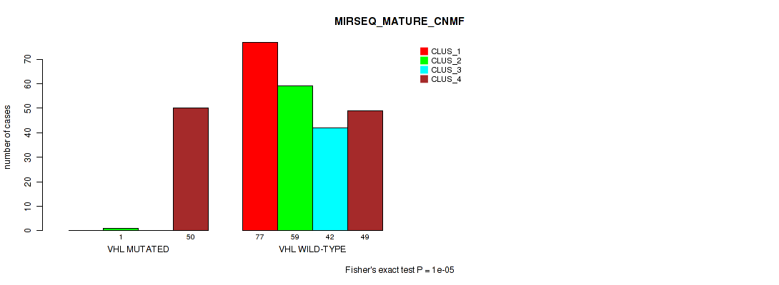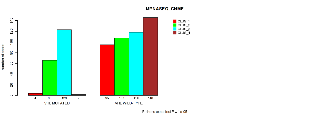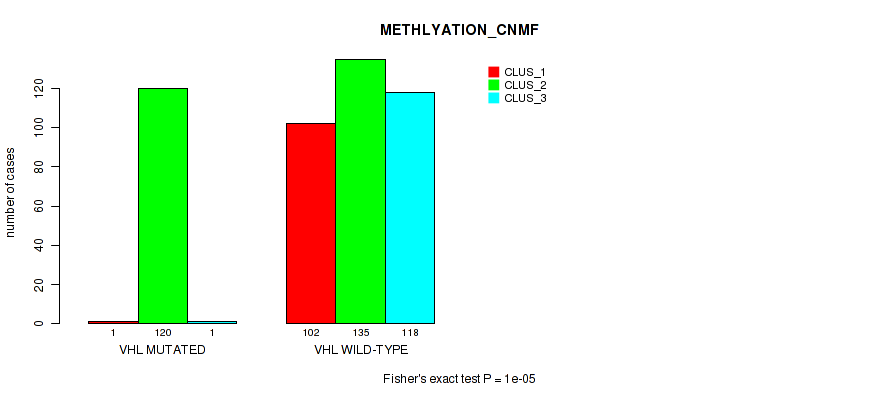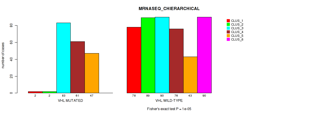 VHL mutation correlated to 'MRNA_CNMF', 'MRNA_CHIERARCHICAL', 'CN_CNMF', 'METHLYATION_CNMF', 'RPPA_CNMF', 'RPPA_CHIERARCHICAL', 'MRNASEQ_CNMF', 'MRNASEQ_CHIERARCHICAL', 'MIRSEQ_CNMF', 'MIRSEQ_CHIERARCHICAL', 'MIRSEQ_MATURE_CNMF', and 'MIRSEQ_MATURE_CHIERARCHICAL'.