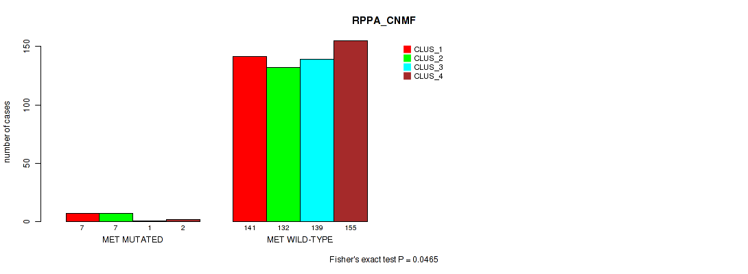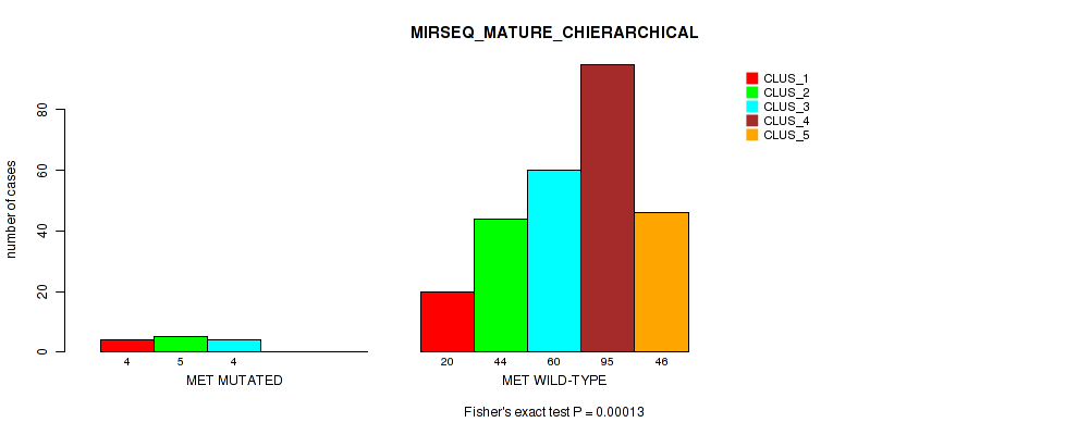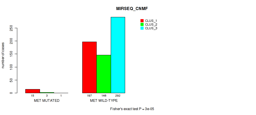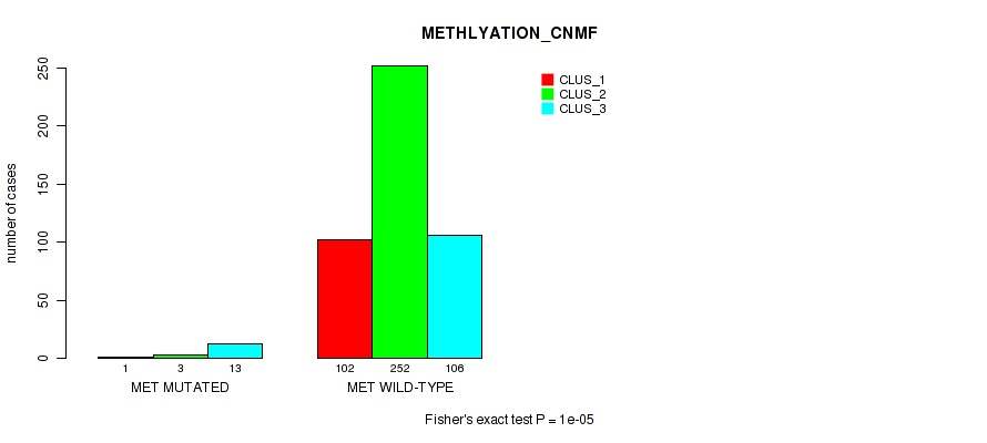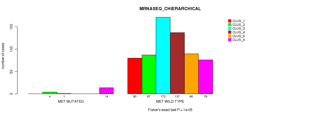 MET mutation correlated to 'CN_CNMF', 'METHLYATION_CNMF', 'RPPA_CNMF', 'MRNASEQ_CNMF', 'MRNASEQ_CHIERARCHICAL', 'MIRSEQ_CNMF', 'MIRSEQ_CHIERARCHICAL', 'MIRSEQ_MATURE_CNMF', and 'MIRSEQ_MATURE_CHIERARCHICAL'.