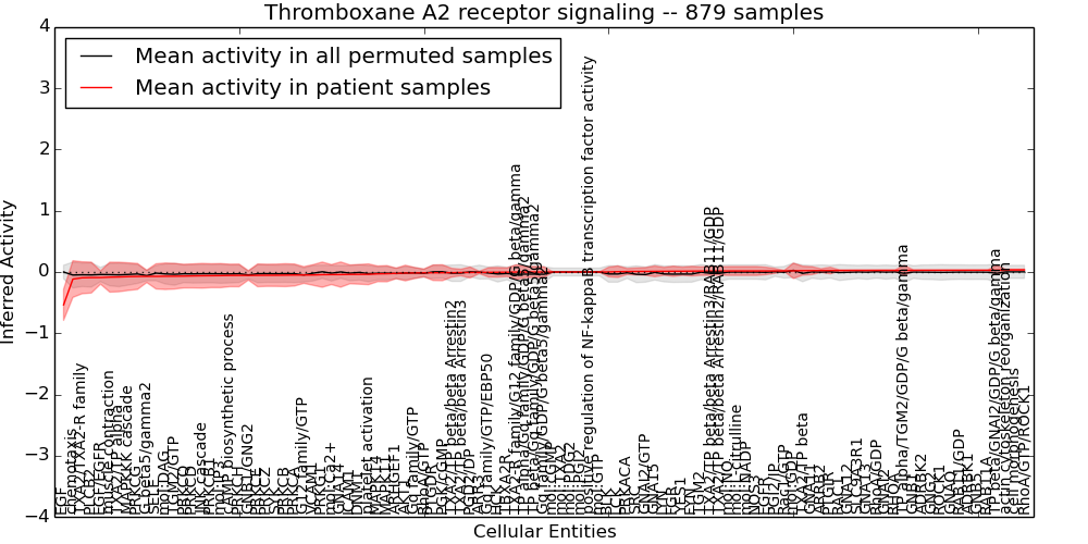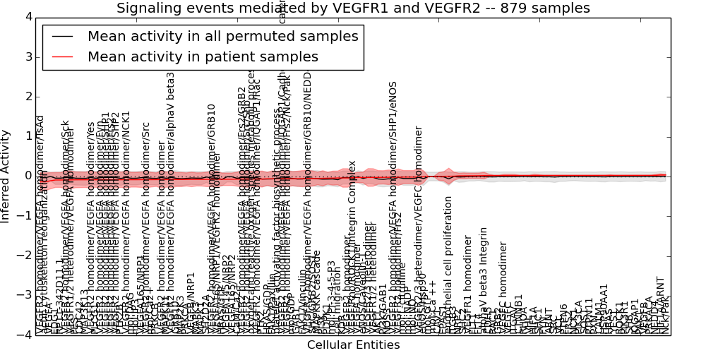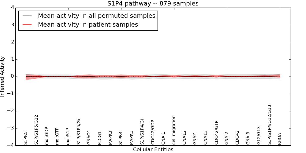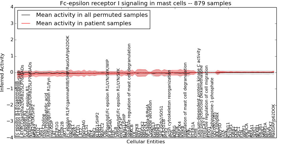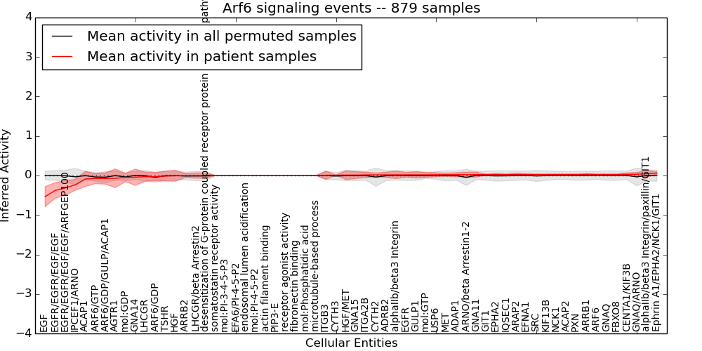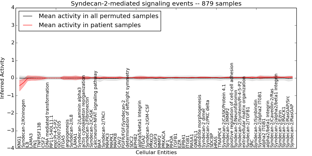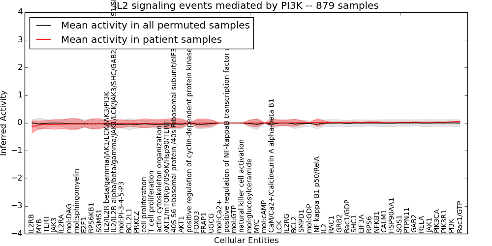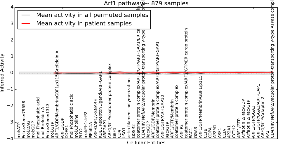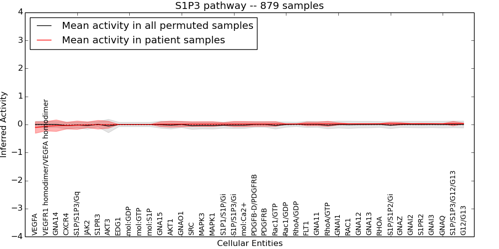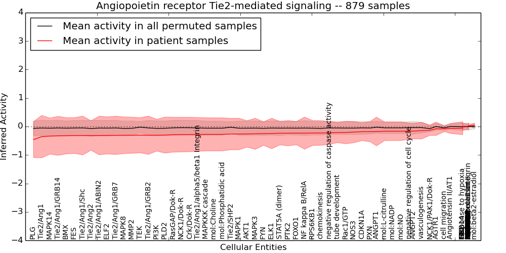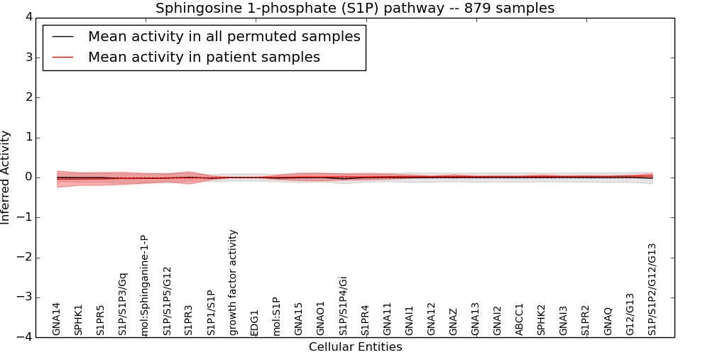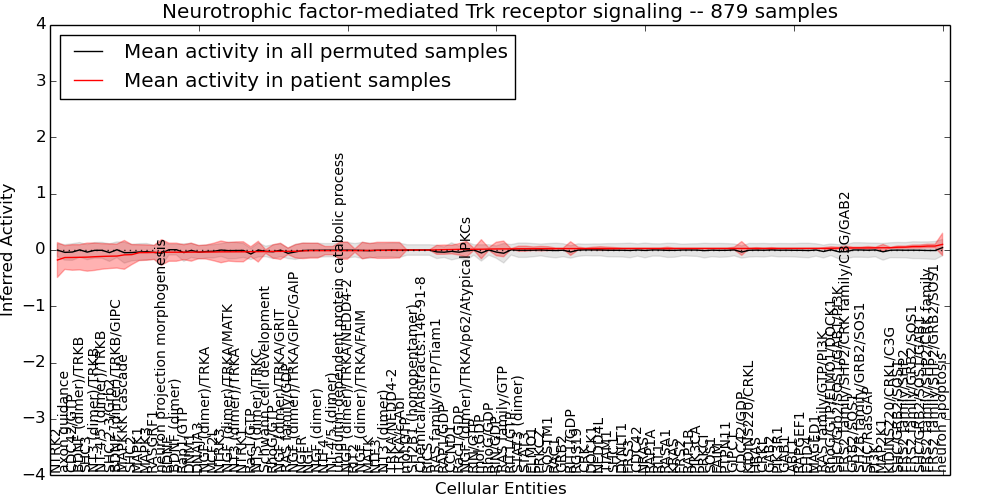 Figure S131. Get High-res Image This plot shows pathway concept perturbations across all samples against a permutation model. The concepts along the x-axis are sorted by lowest to highest mean activity for the real patient samples. Mean inferred activities are plotted along the y-axis as a colored band showing the average level and one standard deviation range. Real samples are shown in red and permuted samples in black.