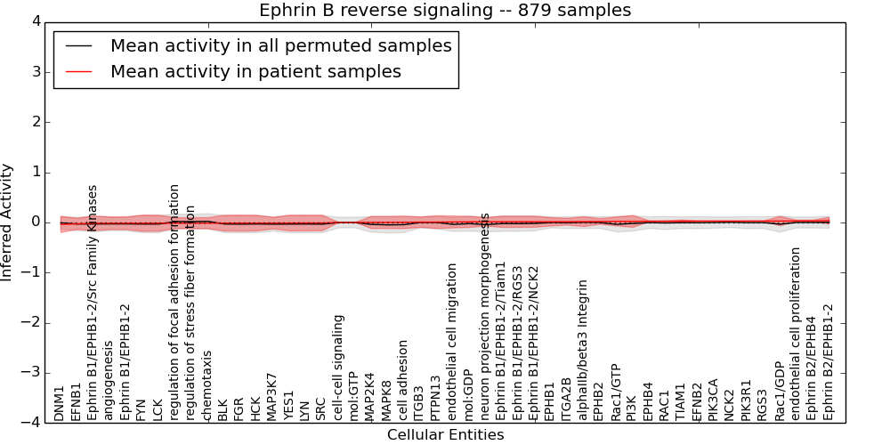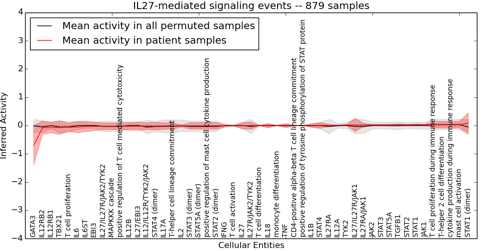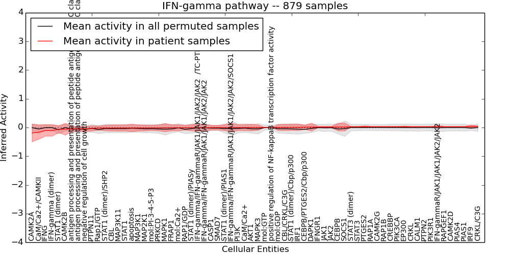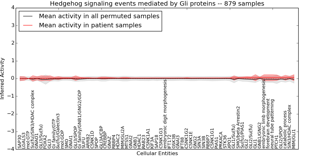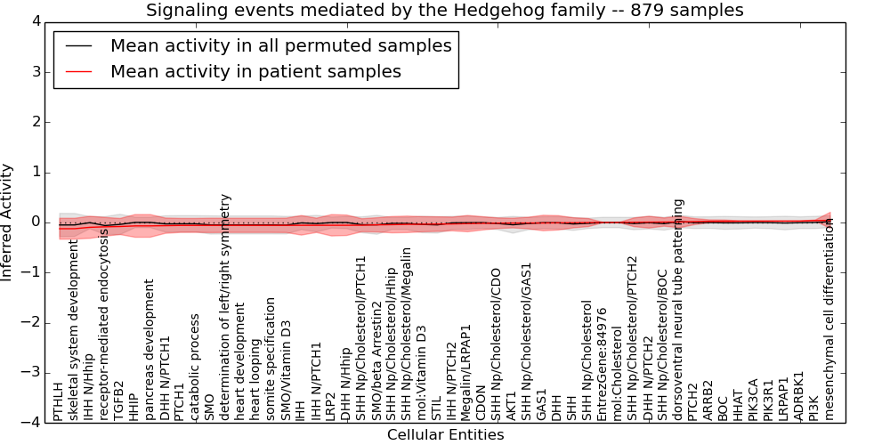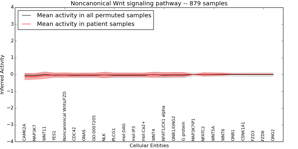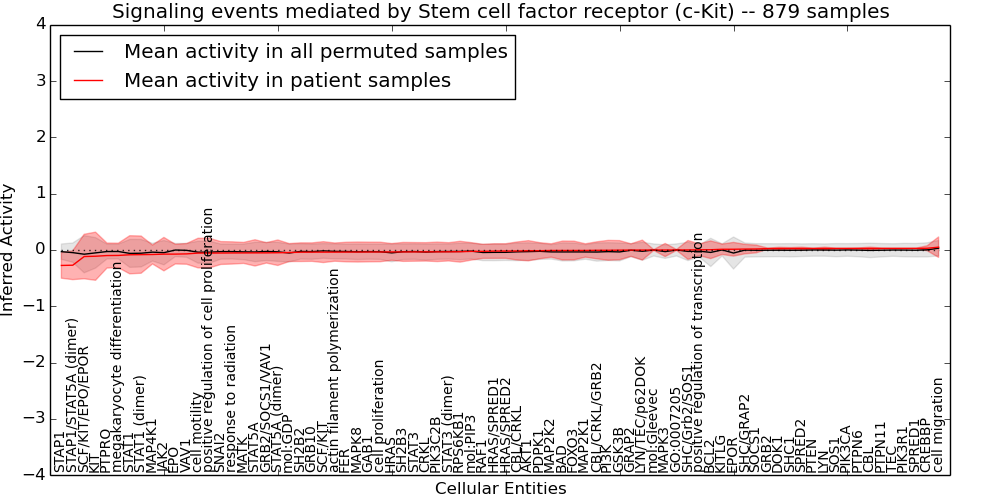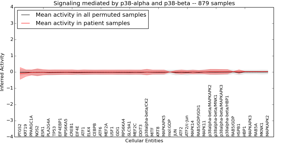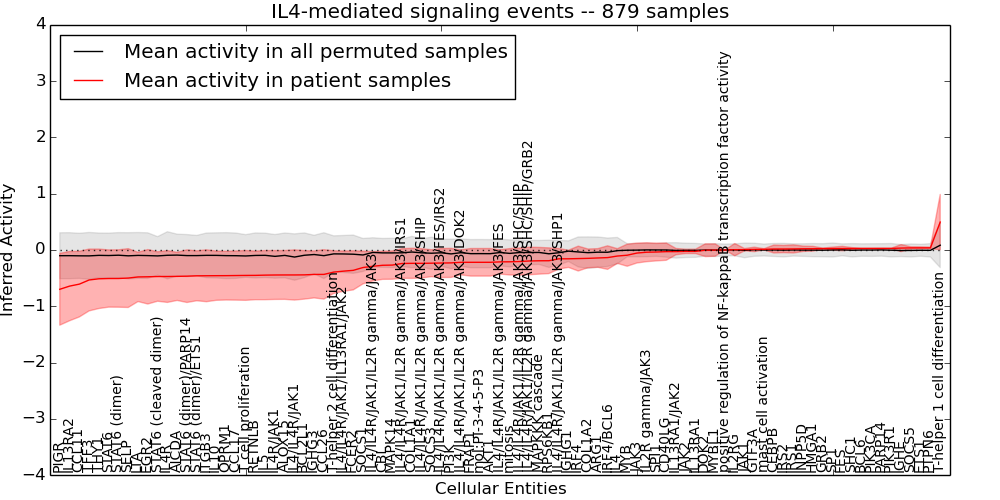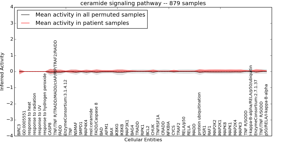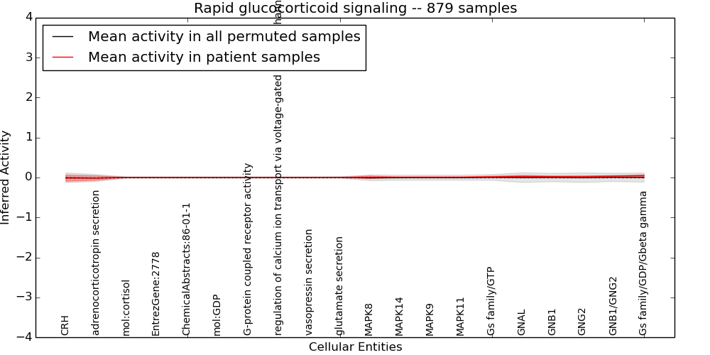 Figure S131. Get High-res Image This plot shows pathway concept perturbations across all samples against a permutation model. The concepts along the x-axis are sorted by lowest to highest mean activity for the real patient samples. Mean inferred activities are plotted along the y-axis as a colored band showing the average level and one standard deviation range. Real samples are shown in red and permuted samples in black.