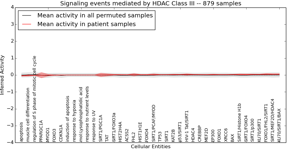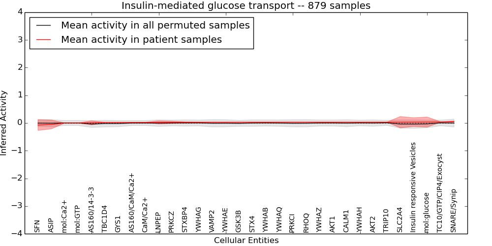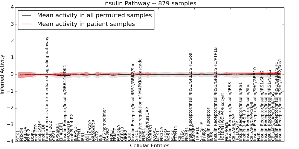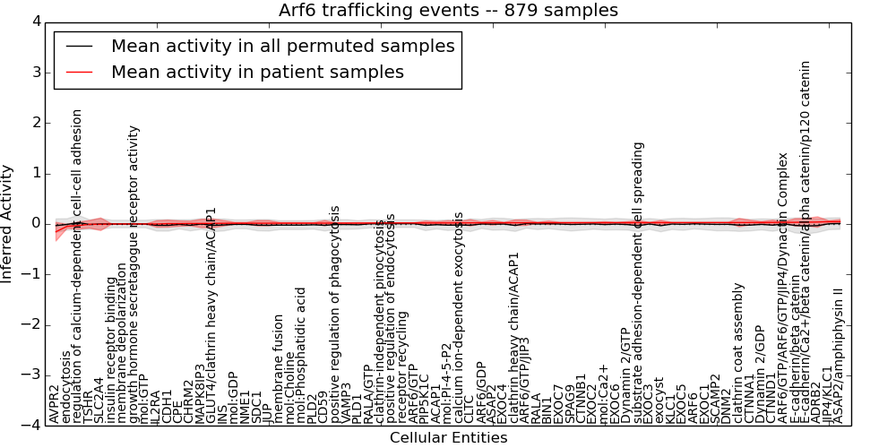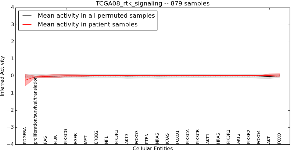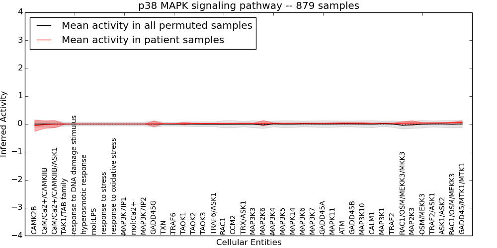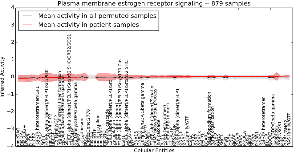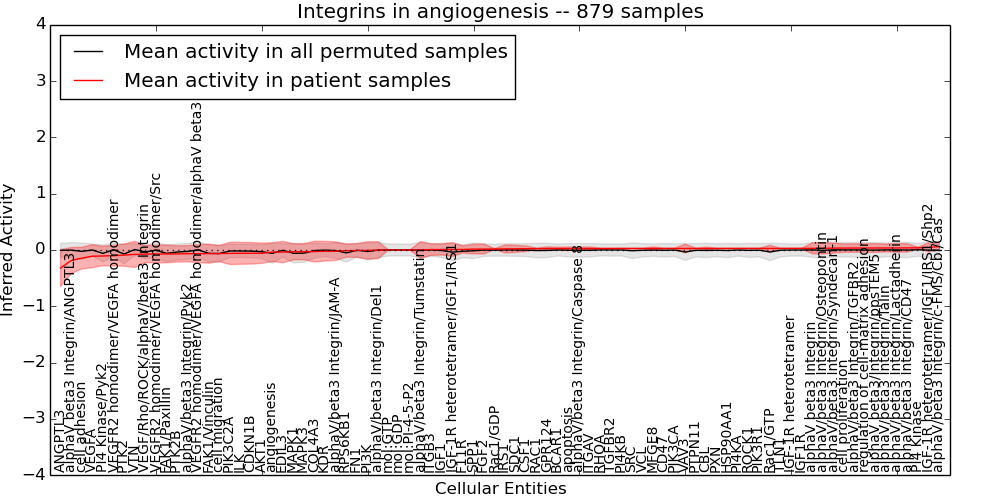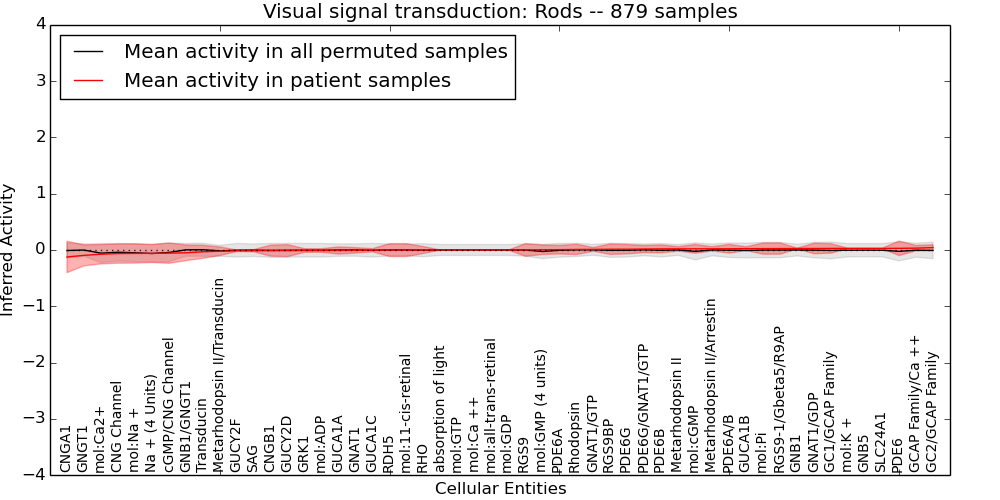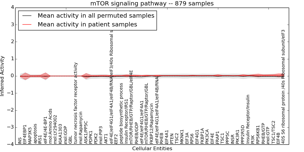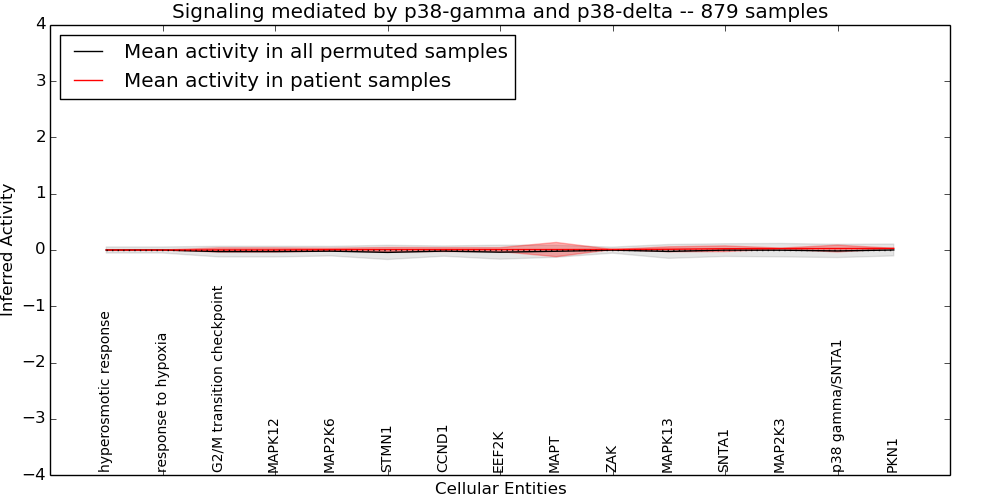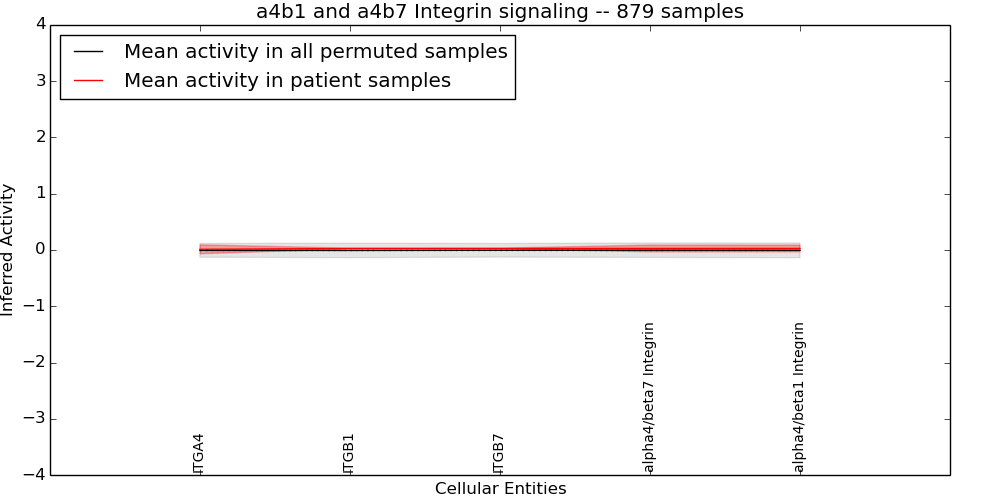 Figure S131. Get High-res Image This plot shows pathway concept perturbations across all samples against a permutation model. The concepts along the x-axis are sorted by lowest to highest mean activity for the real patient samples. Mean inferred activities are plotted along the y-axis as a colored band showing the average level and one standard deviation range. Real samples are shown in red and permuted samples in black.