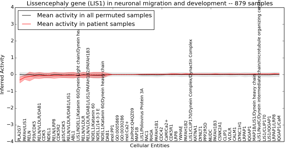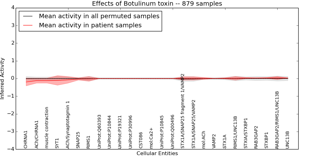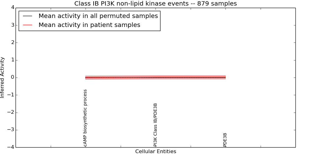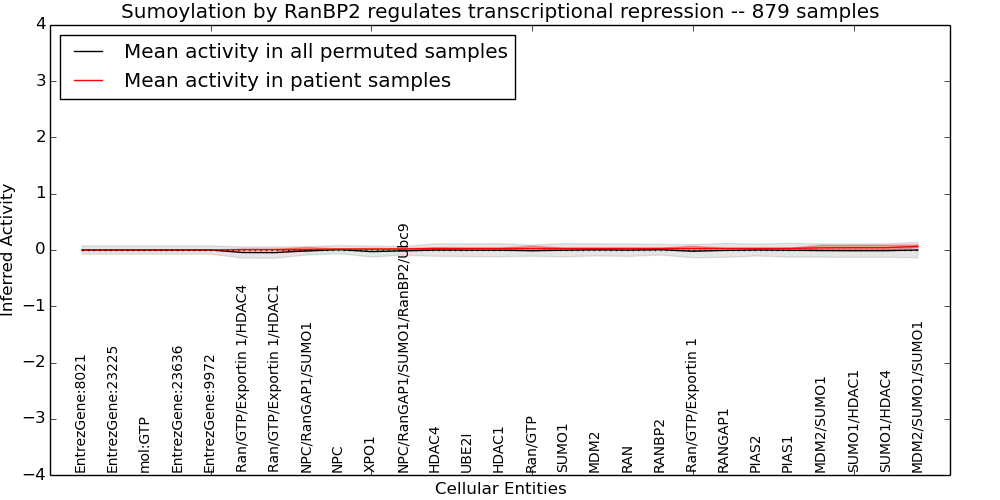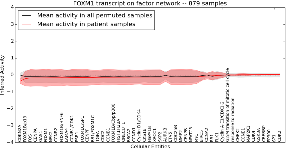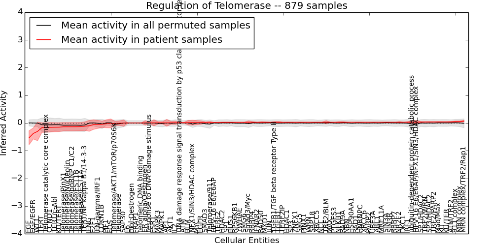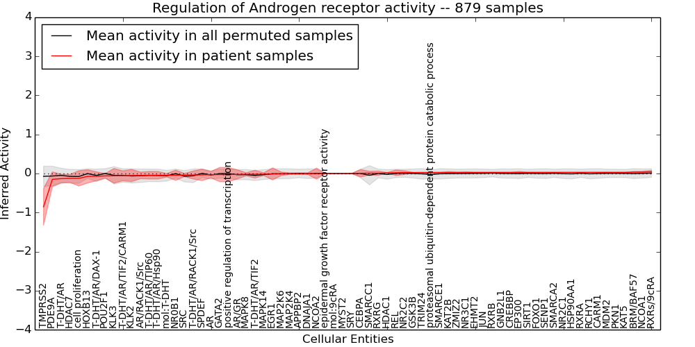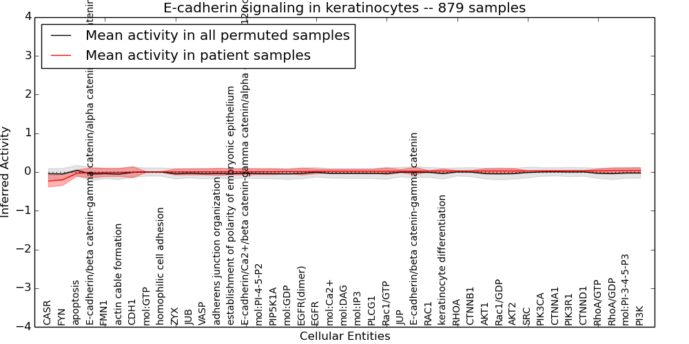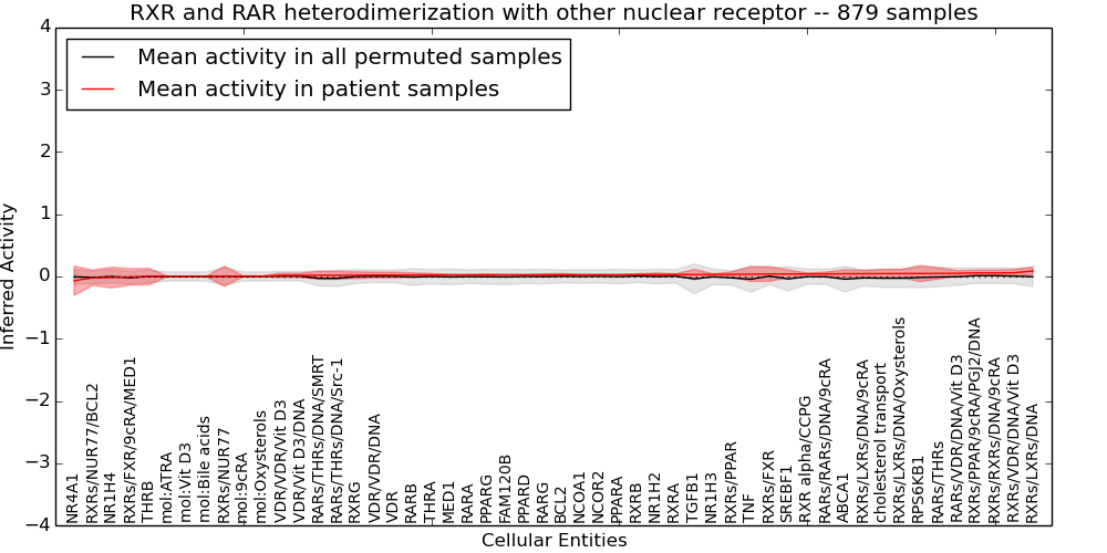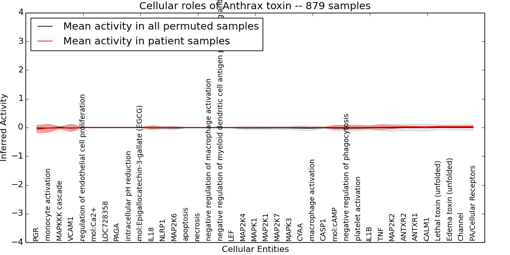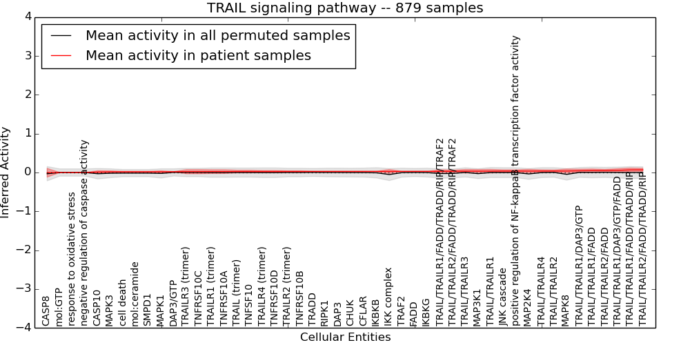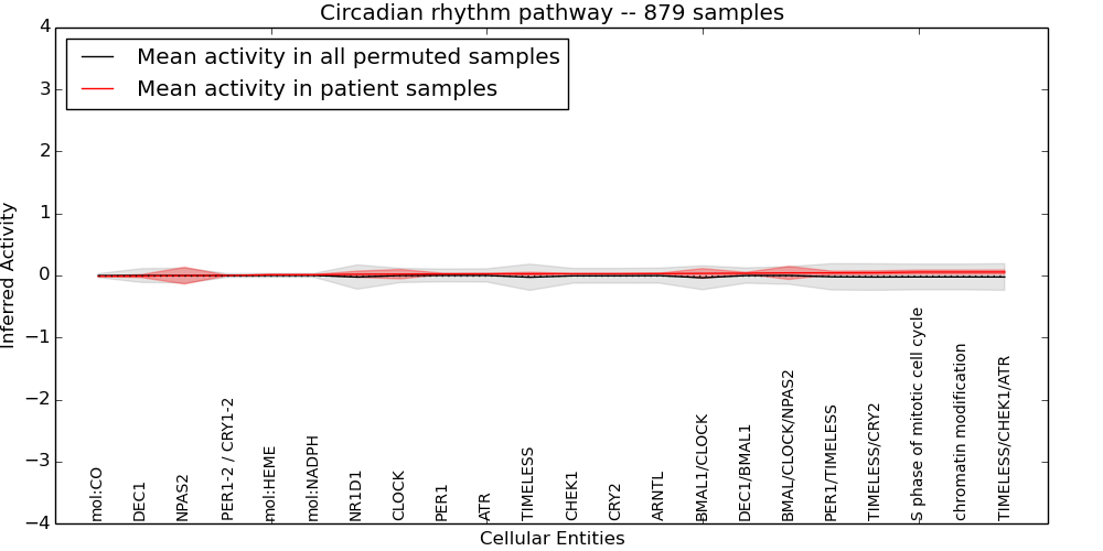 Figure S131. Get High-res Image This plot shows pathway concept perturbations across all samples against a permutation model. The concepts along the x-axis are sorted by lowest to highest mean activity for the real patient samples. Mean inferred activities are plotted along the y-axis as a colored band showing the average level and one standard deviation range. Real samples are shown in red and permuted samples in black.