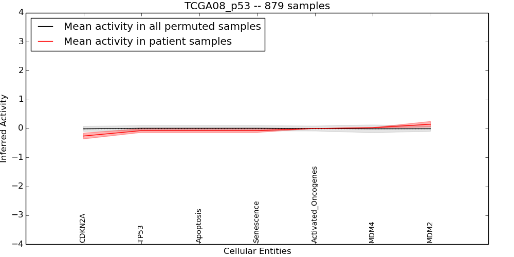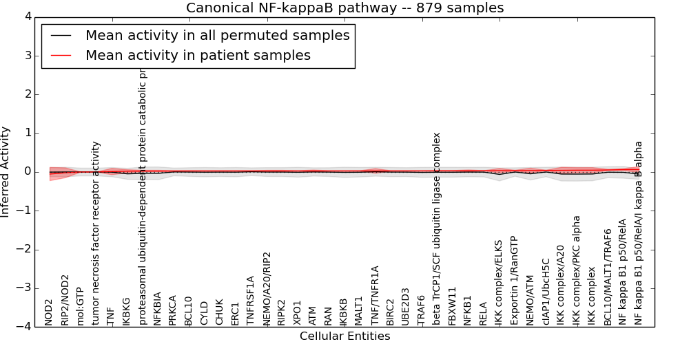 The significance of the IPL obtained for each concept in each patient sample is assessed using a permutation analysis. Importantly, the permutation analysis preserves data tuples so as to preserve any implicit correlations between the different data modalities. For example, genes that are deleted have concomitantly lower expression levels. Preserving the copy number and expression pairs therefore retains this data property. The simulation therefore makes "null samples" by permuting data tuples across all of the genes in the genome so that each gene in a null sample is associated with a random tuple of another gene with equal probability. This approach has the added benefit of preserving the pathway structure so that every observed IPL can be compared to a distribution of random IPLs derived from exactly the same interaction context. PARADIGM inferences are then obtained for 1000 "null" patients and serve as a background distribution to contrast the observed IPLs against. Pathway concepts are excluded from further analysis if they did not obtain a minimum IPL of 0.5 in any patient sample both observed or simulated.