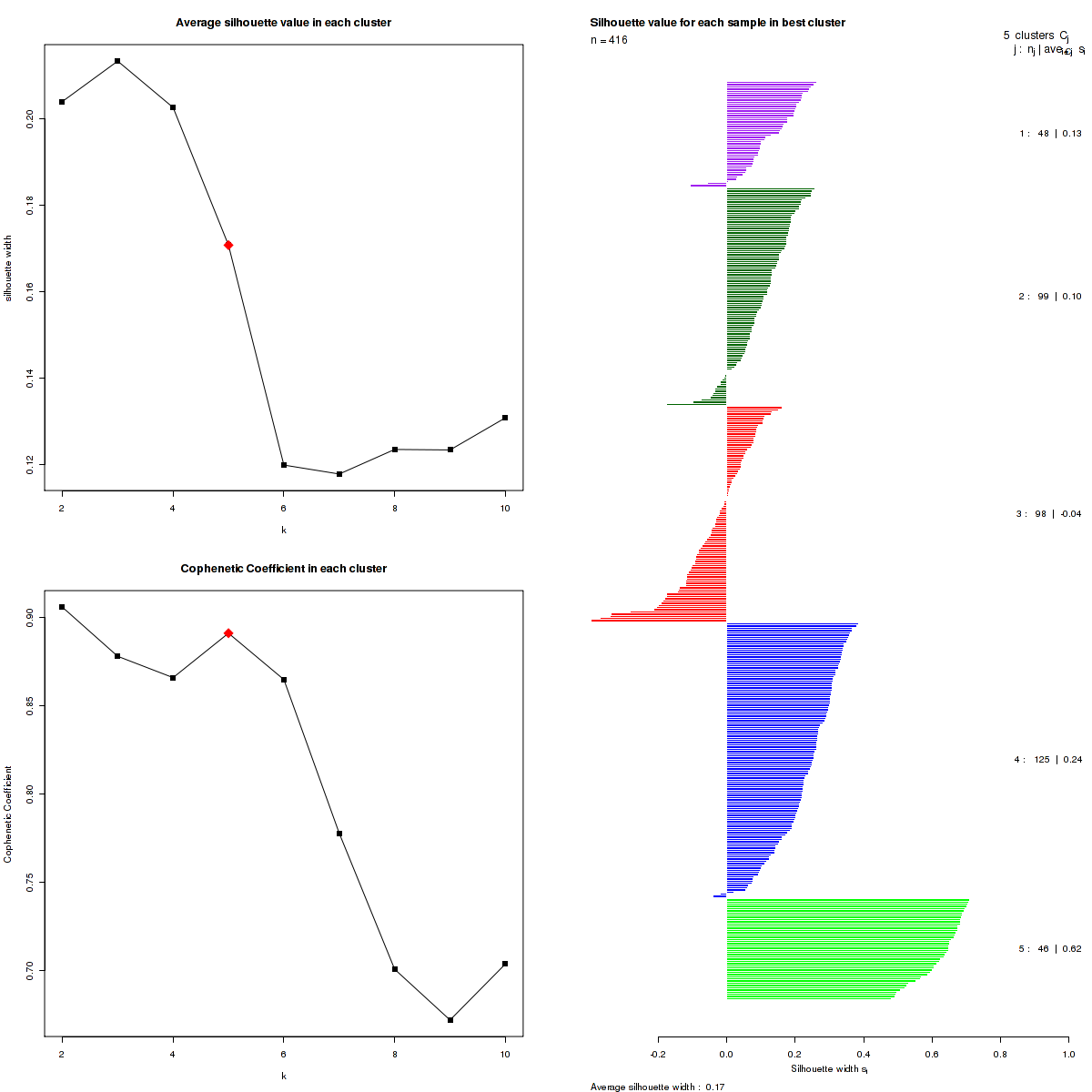 The cophenetic correlation coefficients and average silhouette values are used to determine the k with the most robust clusterings. From the plot of cophenetic correlation versus k, we select modes and the the point preceding the greatest decrease in cophenetic correlation coefficient, and from these choose the k with the highest average silhouette value.