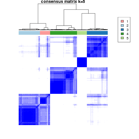 Figure 4. Get High-res Image The consensus matrix after clustering shows 5 clusters with limited overlap between clusters.
