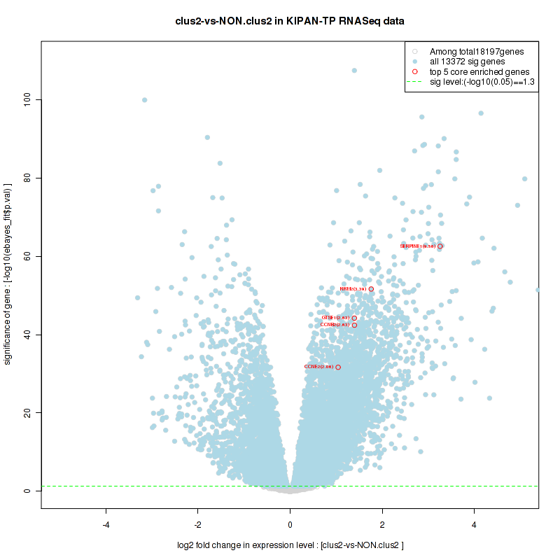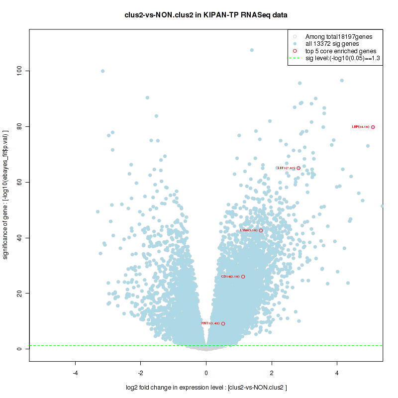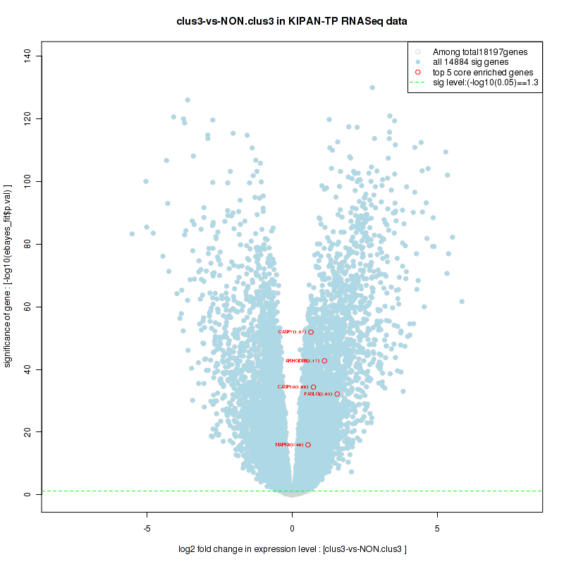 Figure S78.  Get High-res Image For the top 5 core enriched genes in the pathway: KEGG SELENOAMINO ACID METABOLISM, this volcano plot shows how much they are up/down-regulated and significant. The significance was calculated by empirical bayesian fit