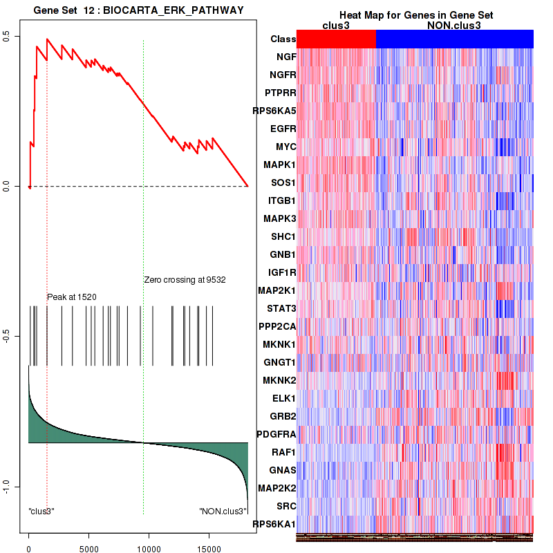 Table S1.  Get Full Table This table shows a Running Enrichment Score (RES) of each gene in this pathway, that is, the enrichment score at this point in the ranked list of genes. All genes are ranked by Signal-to-Noise (S2N), a measure of similarity as default and are used to obtain ES matrix of all genes. In this way, GSEA tool uses expression pattern of not only overlapped genes but also not-overlapped genes to produce ES matrix.