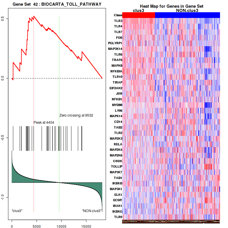 • Top enriched gene sets are BIOCARTA NO1 PATHWAY, BIOCARTA ERK PATHWAY, BIOCARTA FAS PATHWAY, BIOCARTA FCER1 PATHWAY, BIOCARTA MET PATHWAY, BIOCARTA TCR PATHWAY, BIOCARTA PAR1 PATHWAY, BIOCARTA TOLL PATHWAY, BIOCARTA VEGF PATHWAY, KEGG TRYPTOPHAN METABOLISM