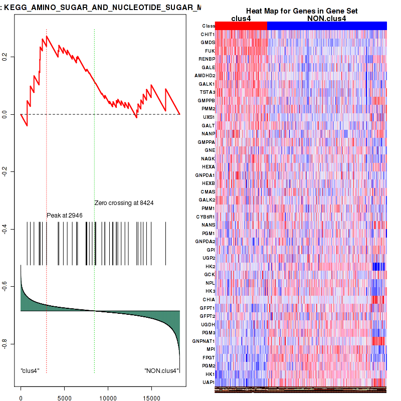 Figure S79.  Get High-res Image This plot shows mRNAseq_cNMF expression data heatmap (on the left) a RunningEnrichmentScore(RES) plot (on the top right) and a Signal2Noise(S2N) plot (on the bottom right) of genes in the pathway: KEGG AMINO SUGAR AND NUCLEOTIDE SUGAR METABOLISM.