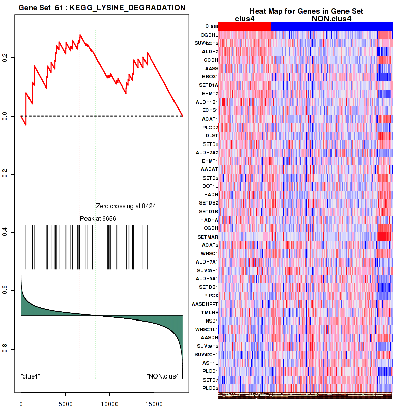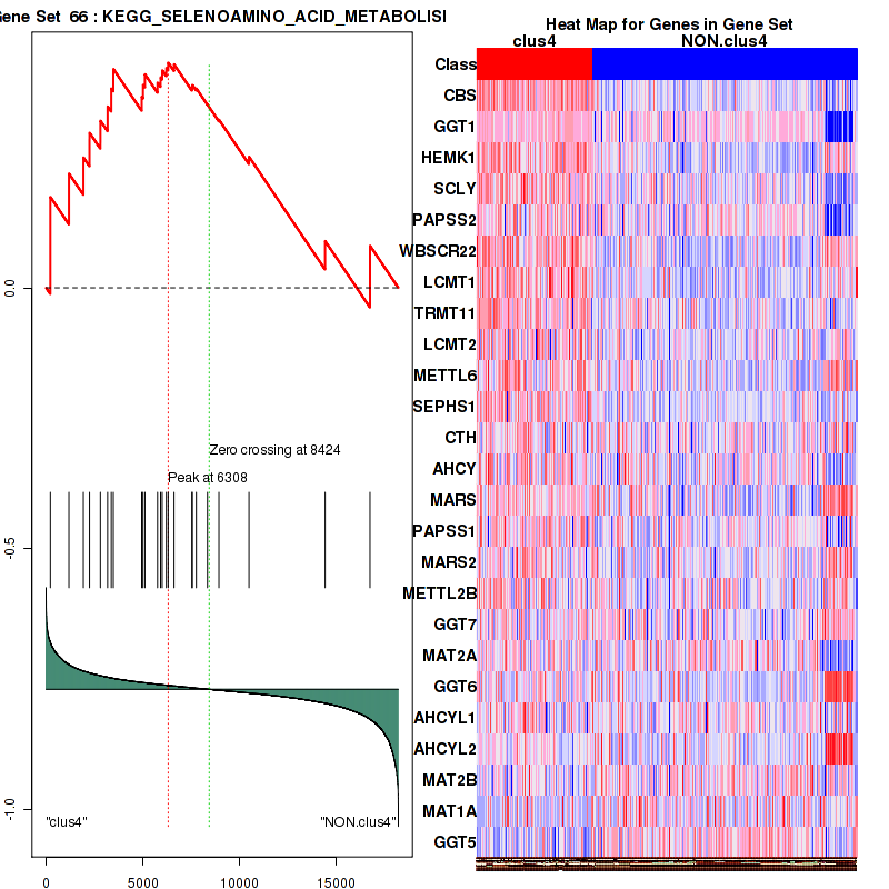 Figure S77.  Get High-res Image This plot shows mRNAseq_cNMF expression data heatmap (on the left) a RunningEnrichmentScore(RES) plot (on the top right) and a Signal2Noise(S2N) plot (on the bottom right) of genes in the pathway: KEGG SELENOAMINO ACID METABOLISM.