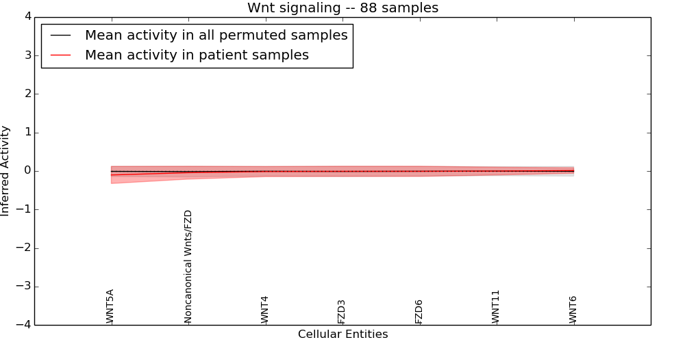 Figure S129. Get High-res Image This plot shows pathway concept perturbations across all samples against a permutation model. The concepts along the x-axis are sorted by lowest to highest mean activity for the real patient samples. Mean inferred activities are plotted along the y-axis as a colored band showing the average level and one standard deviation range. Real samples are shown in red and permuted samples in black.