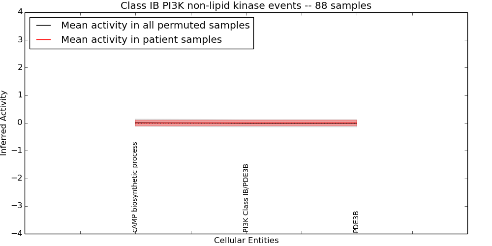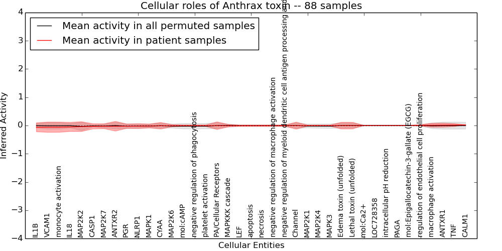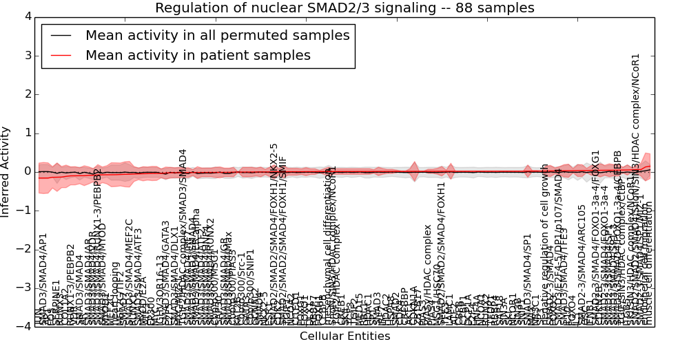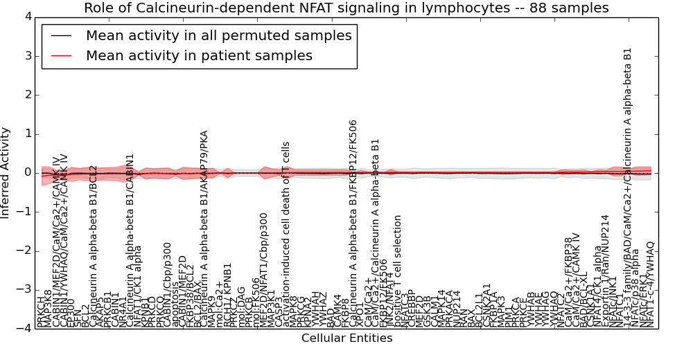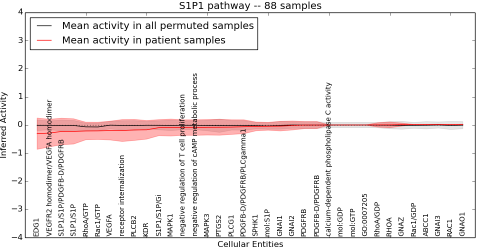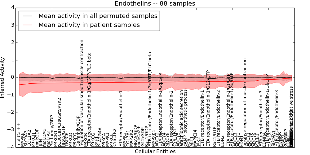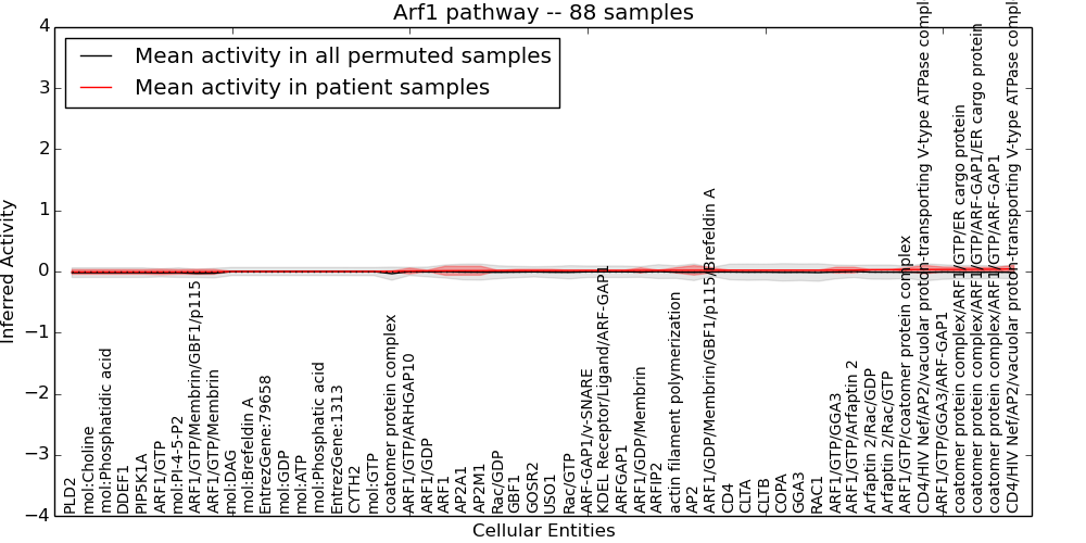 Figure S131. Get High-res Image This plot shows pathway concept perturbations across all samples against a permutation model. The concepts along the x-axis are sorted by lowest to highest mean activity for the real patient samples. Mean inferred activities are plotted along the y-axis as a colored band showing the average level and one standard deviation range. Real samples are shown in red and permuted samples in black.
