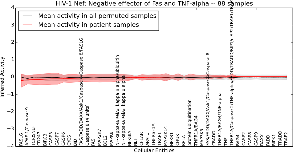 Figure S130. Get High-res Image This plot shows pathway concept perturbations across all samples against a permutation model. The concepts along the x-axis are sorted by lowest to highest mean activity for the real patient samples. Mean inferred activities are plotted along the y-axis as a colored band showing the average level and one standard deviation range. Real samples are shown in red and permuted samples in black.
