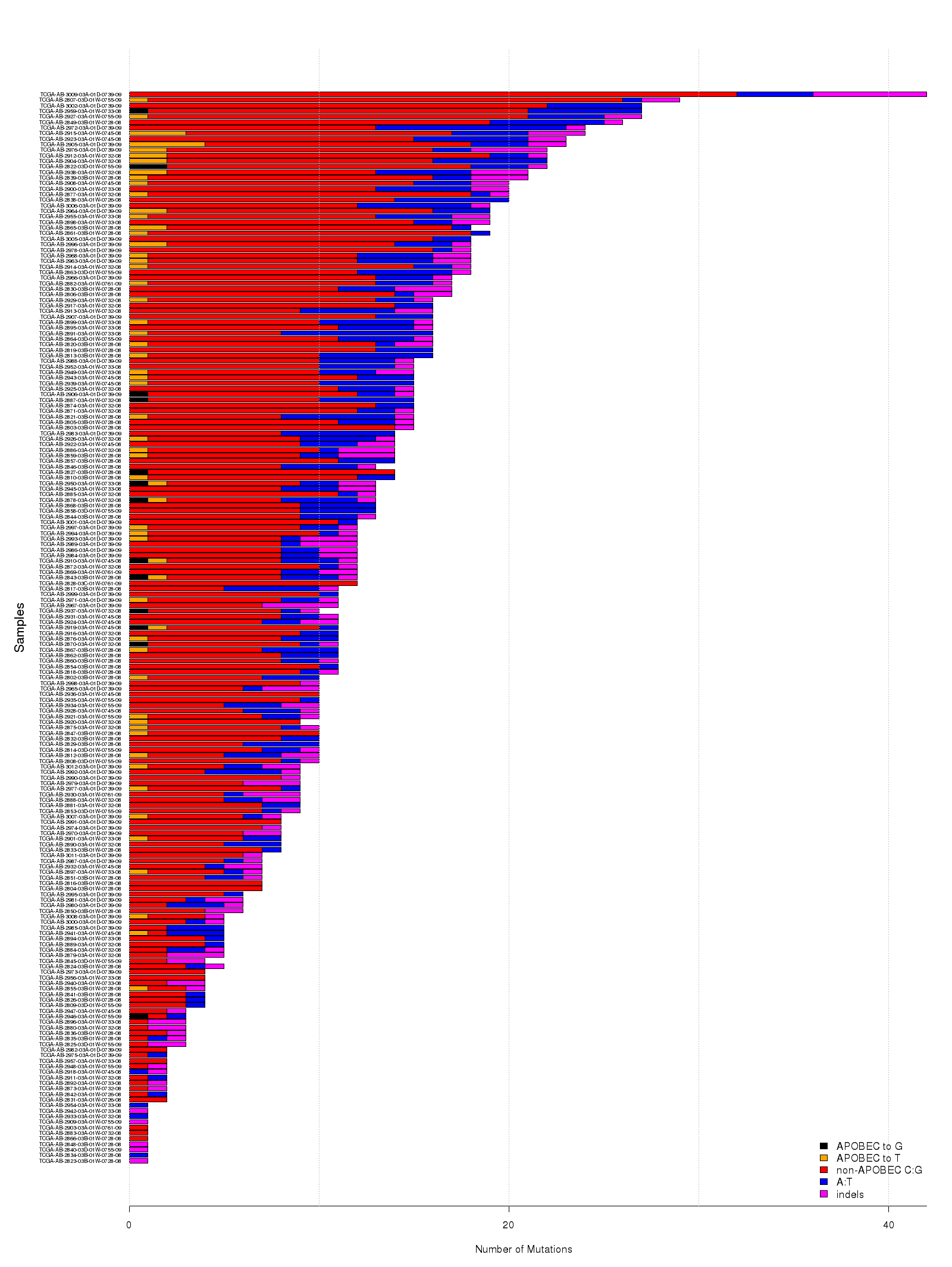 Figure 4. Get High-res Image Numbers of APOBEC and non-APOBEC mutations (X-axis) in each sample (Y-axis). All values are calculated based on the values in the columns “indels”, “substitutions”, and columns containing individual substitution types in the “*_sorted_sum_all_fisher_Pcorr.txt” file. “APOBEC to G” – number of tCw→tGw mutations; “APOBEC to T” – number of tCw→tTw mutations; “non-APOBEC C:G” – number of mutations in C:G base pairs not conforming to the APOBEC signature (= total of tCw→tAw plus all mutations in C not occurring in the tCw motif); “A:T” –- all mutations in A:T base pairs; “indels” – all indels. All counts include complementary mutations. Samples are ordered by total mutation counts in the descending order. Since only base substitutions are shown, bars with excessive numbers of non-substitution mutations may be shorter than the two flanking bars.