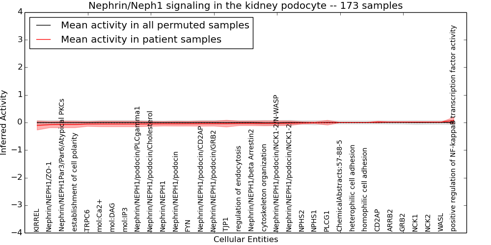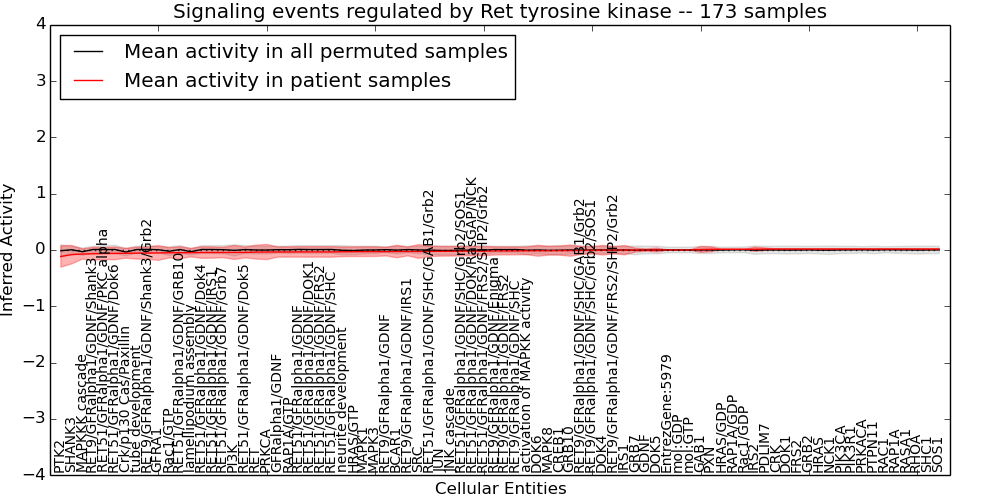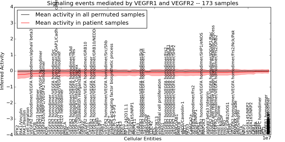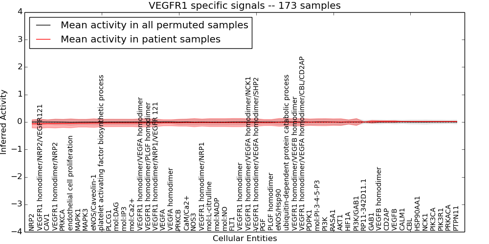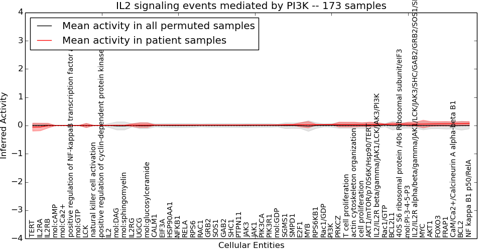 Figure S131.  Get High-res Image This plot shows pathway concept perturbations across all samples against a permutation model. The concepts along the x-axis are sorted by lowest to highest mean activity for the real patient samples. Mean inferred activities are plotted along the y-axis as a colored band showing the average level and one standard deviation range. Real samples are shown in red and permuted samples in black.