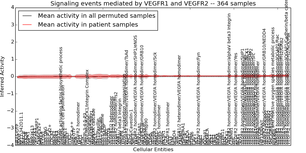 Figure S128. Get High-res Image This plot shows pathway concept perturbations across all samples against a permutation model. The concepts along the x-axis are sorted by lowest to highest mean activity for the real patient samples. Mean inferred activities are plotted along the y-axis as a colored band showing the average level and one standard deviation range. Real samples are shown in red and permuted samples in black.