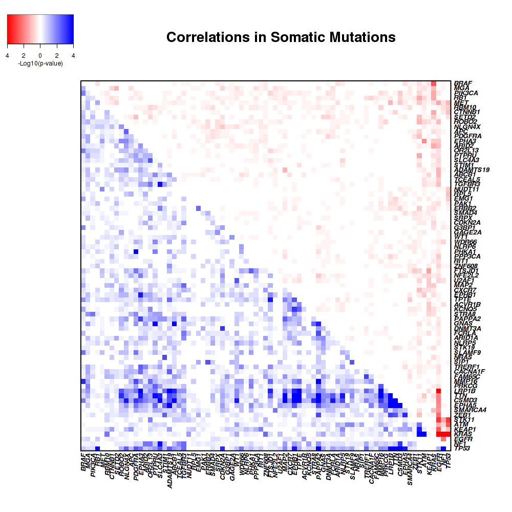 Figure 3.  Get High-res Image Co-occurring and mutually-exclusive pairs for significantly mutated genes. Blue means two events are co-occurring and red means two events are mutually-exclusive.