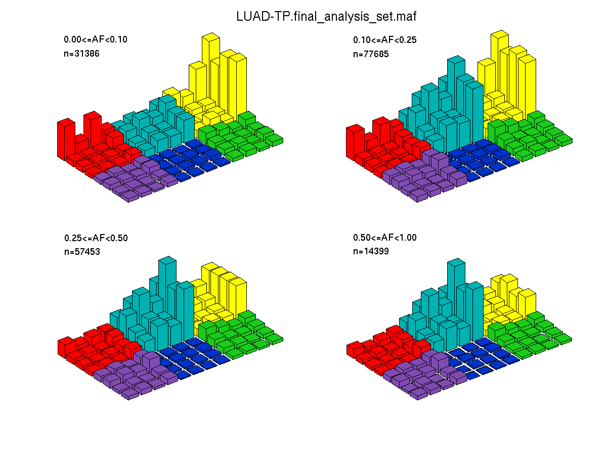 The mutation spectrum is depicted in the lego plots below in which the 96 possible mutation types are subdivided into six large blocks, color-coded to reflect the base substitution type. Each large block is further subdivided into the 16 possible pairs of 5' and 3' neighbors, as listed in the 4x4 trinucleotide context legend. The height of each block corresponds to the mutation frequency for that kind of mutation (counts of mutations normalized by the base coverage in a given bin). The shape of the spectrum is a signature for dominant mutational mechanisms in different tumor types.