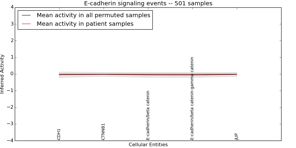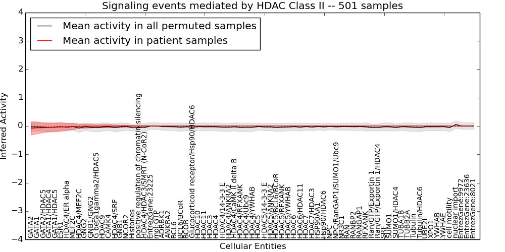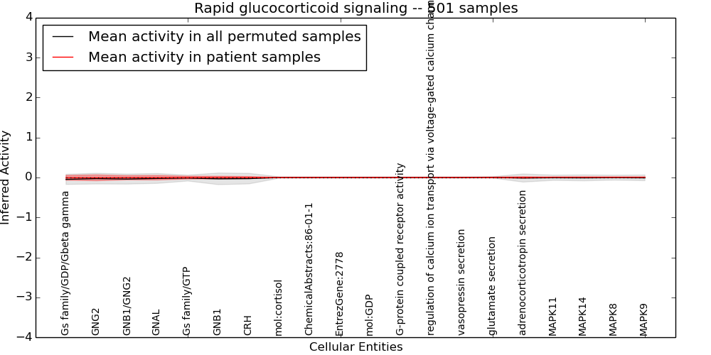 Figure S128. Get High-res Image This plot shows pathway concept perturbations across all samples against a permutation model. The concepts along the x-axis are sorted by lowest to highest mean activity for the real patient samples. Mean inferred activities are plotted along the y-axis as a colored band showing the average level and one standard deviation range. Real samples are shown in red and permuted samples in black.