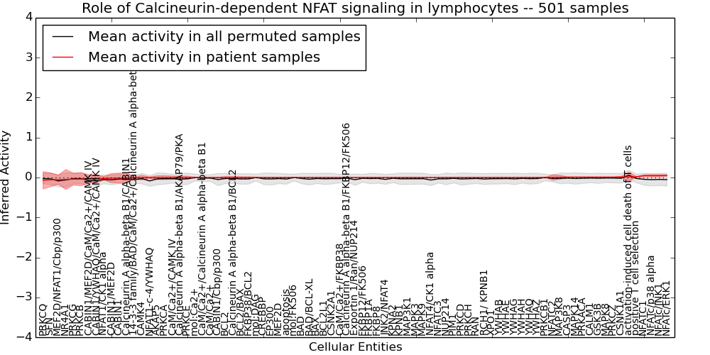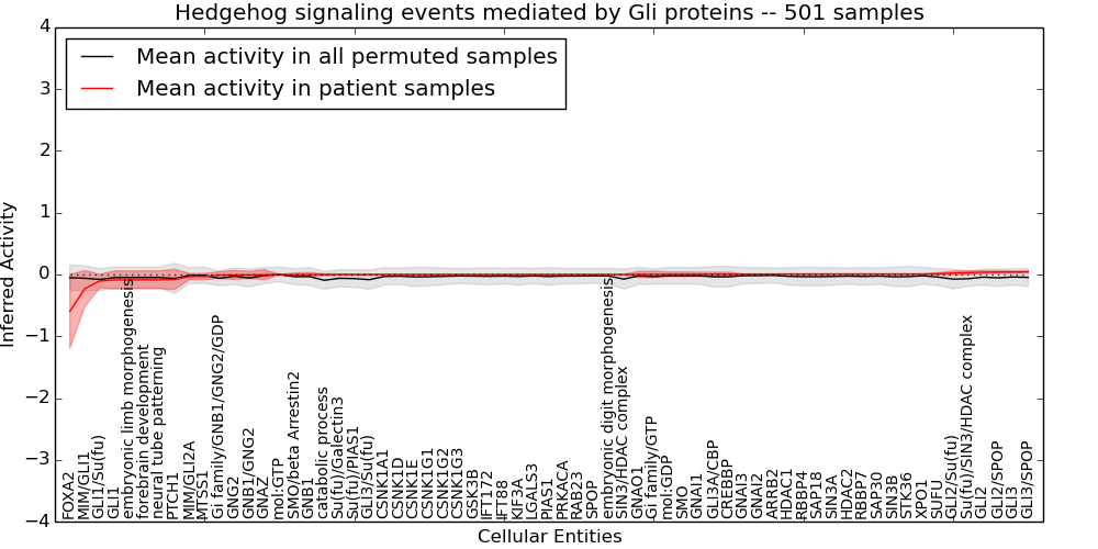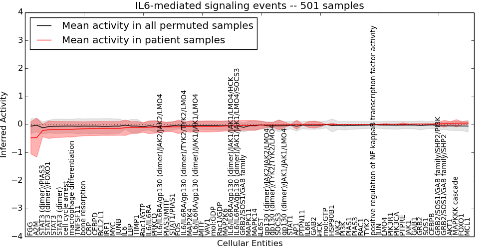 Figure S131. Get High-res Image This plot shows pathway concept perturbations across all samples against a permutation model. The concepts along the x-axis are sorted by lowest to highest mean activity for the real patient samples. Mean inferred activities are plotted along the y-axis as a colored band showing the average level and one standard deviation range. Real samples are shown in red and permuted samples in black.