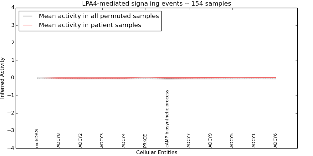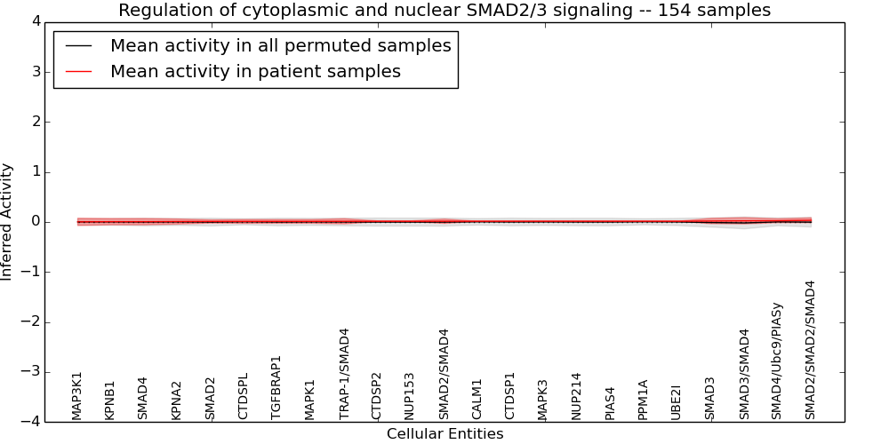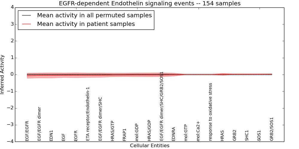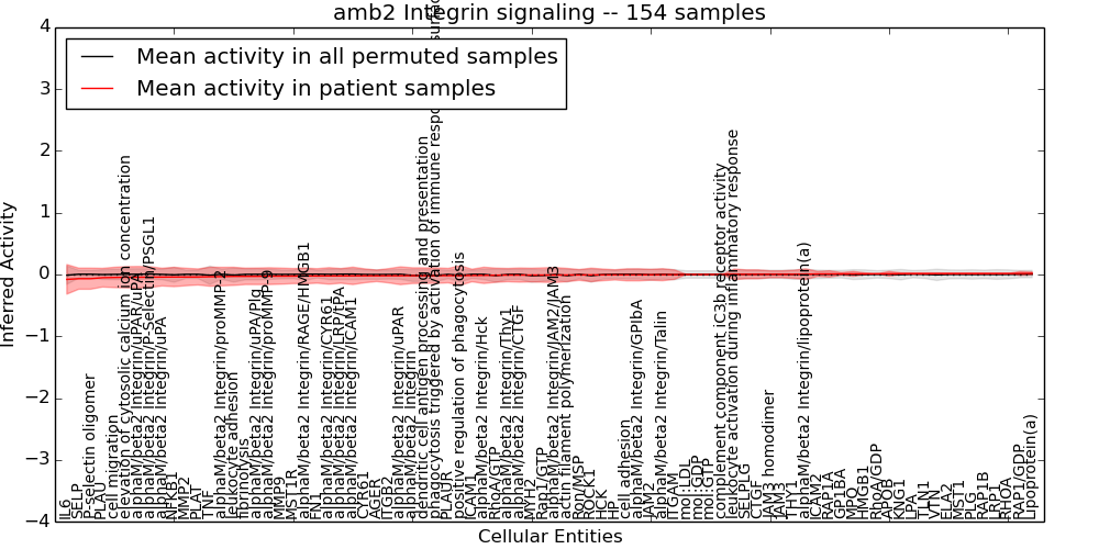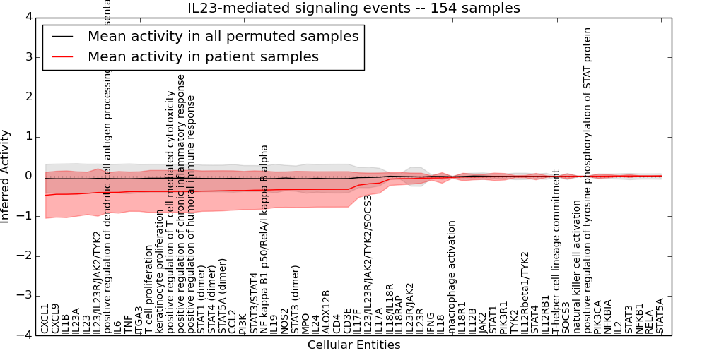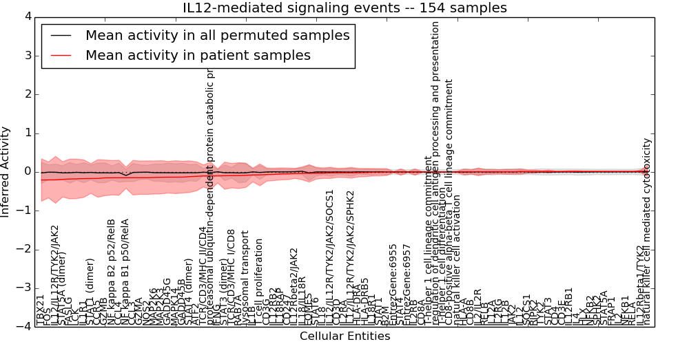 Figure S125. Get High-res Image This plot shows pathway concept perturbations across all samples against a permutation model. The concepts along the x-axis are sorted by lowest to highest mean activity for the real patient samples. Mean inferred activities are plotted along the y-axis as a colored band showing the average level and one standard deviation range. Real samples are shown in red and permuted samples in black.