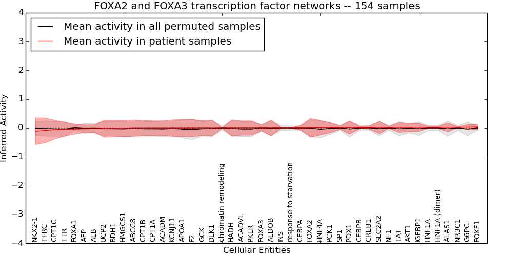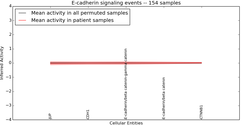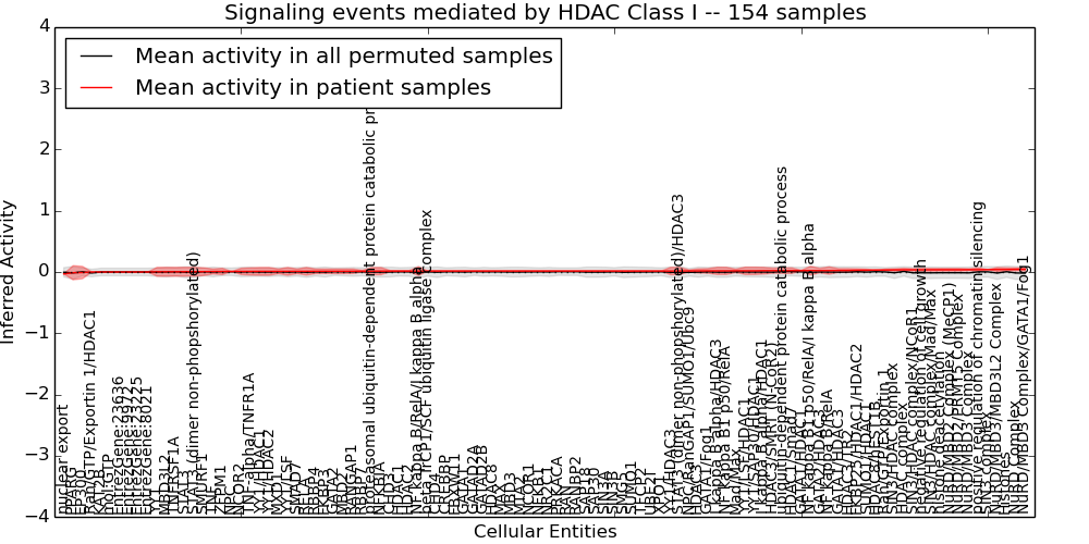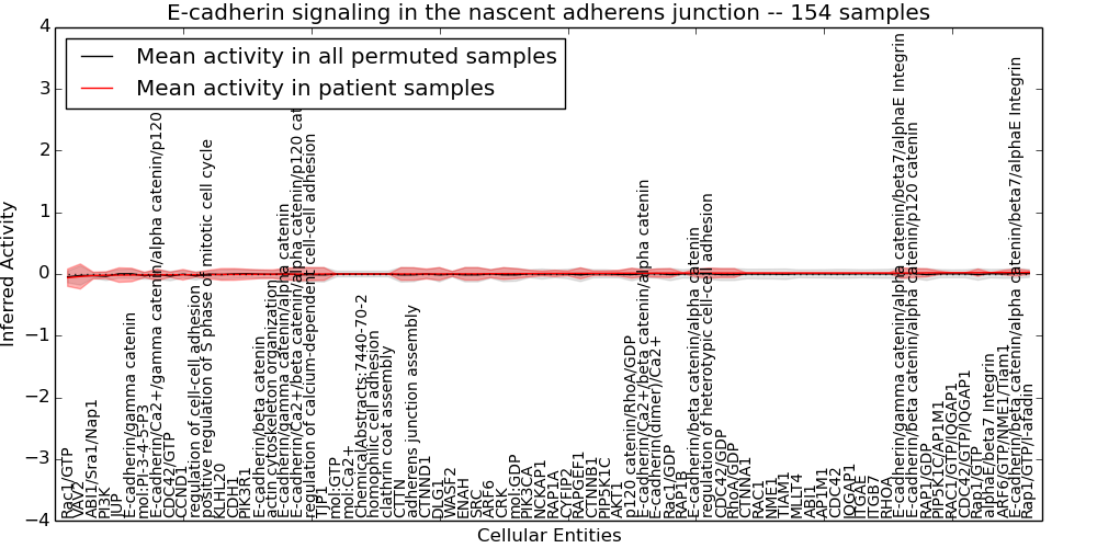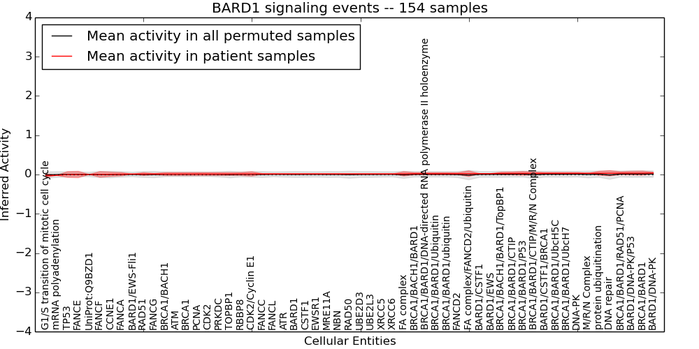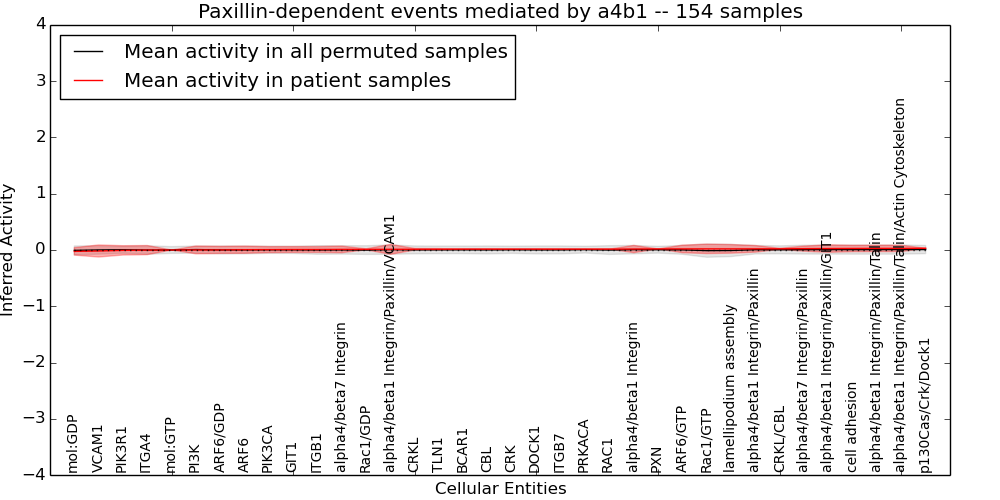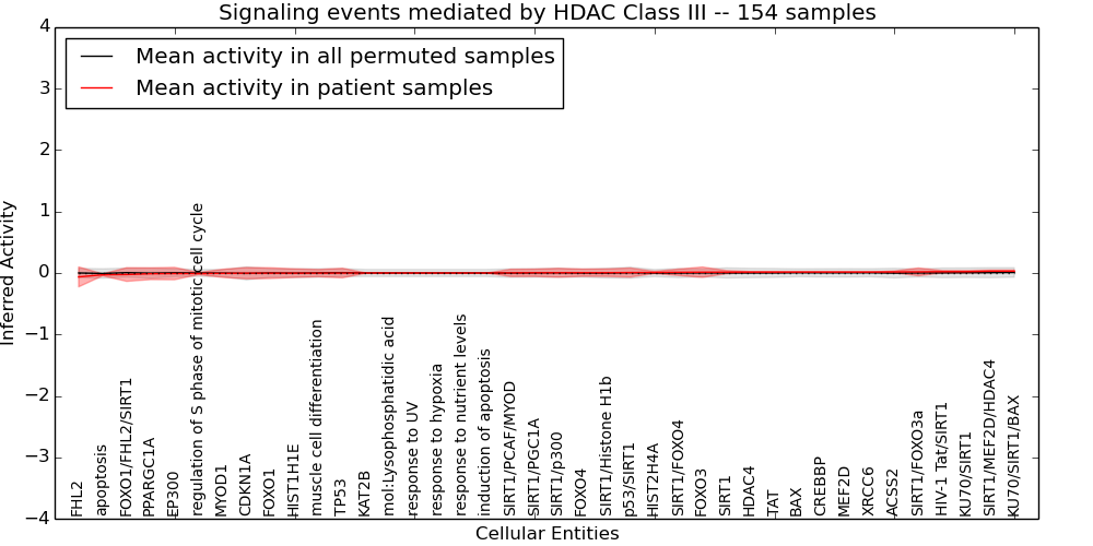 Figure S125. Get High-res Image This plot shows pathway concept perturbations across all samples against a permutation model. The concepts along the x-axis are sorted by lowest to highest mean activity for the real patient samples. Mean inferred activities are plotted along the y-axis as a colored band showing the average level and one standard deviation range. Real samples are shown in red and permuted samples in black.
