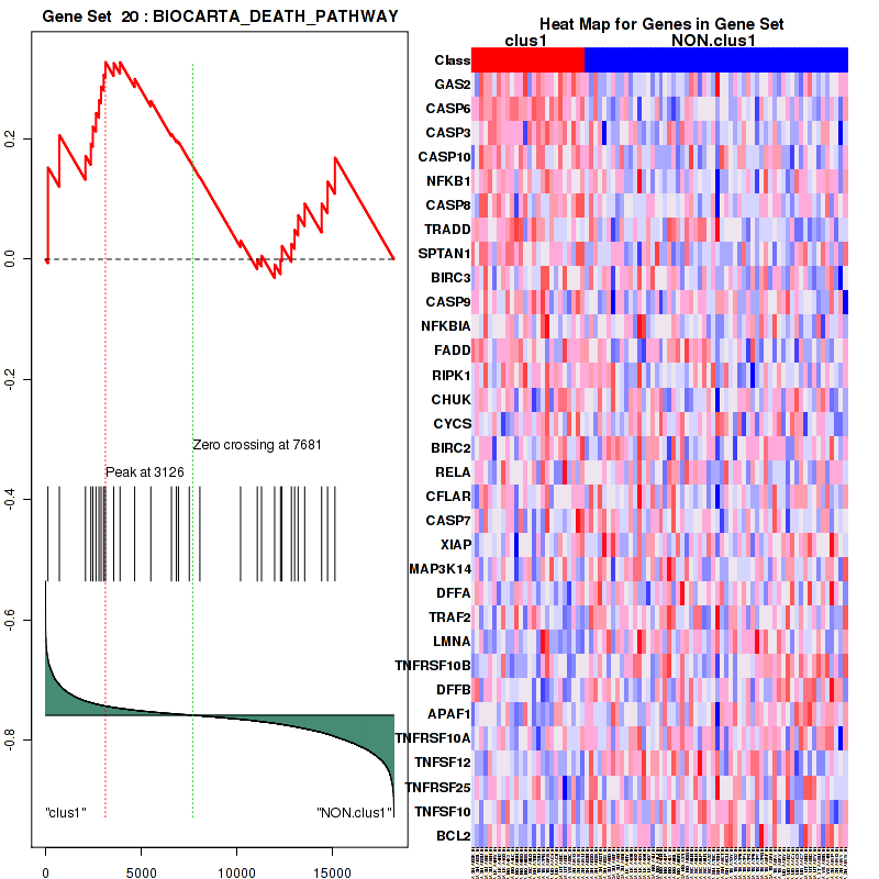 Figure S1. Get High-res Image This plot shows mRNAseq_cNMF expression data heatmap (on the left) a RunningEnrichmentScore(RES) plot (on the top right) and a Signal2Noise(S2N) plot (on the bottom right) of genes in the pathway: BIOCARTA DEATH PATHWAY.