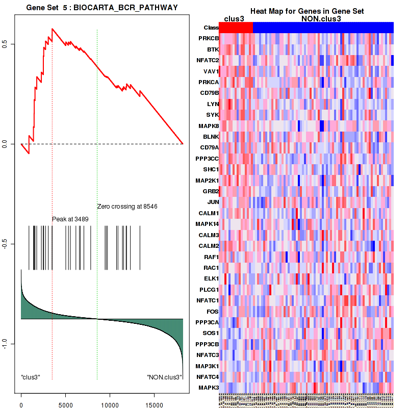 Top enriched gene sets are BIOCARTA BCR PATHWAY, BIOCARTA HIVNEF PATHWAY, BIOCARTA IL2RB PATHWAY, BIOCARTA RACCYCD PATHWAY, BIOCARTA INTEGRIN PATHWAY, BIOCARTA TCR PATHWAY, BIOCARTA VEGF PATHWAY, KEGG PROTEASOME, KEGG CHEMOKINE SIGNALING PATHWAY, KEGG CELL CYCLE