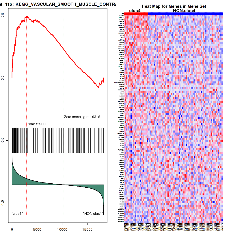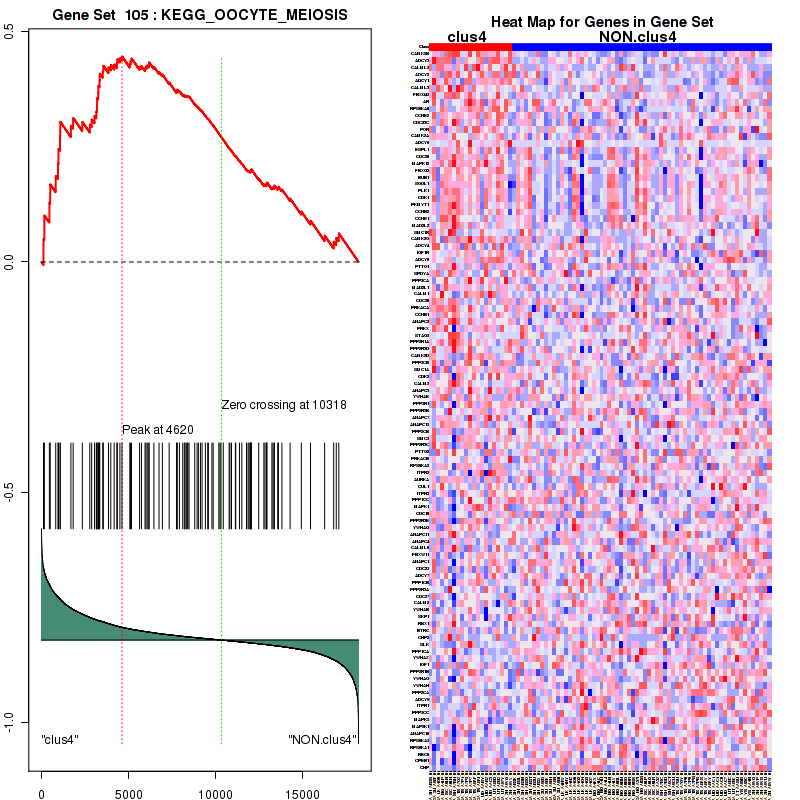 For the expression subtypes of 18203 genes in 87 samples, GSEA found enriched gene sets in each cluster using 86 gene sets in MSigDB canonical pathways. Top enriched gene sets are listed as below.