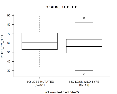 Table S25. Gene #70: '16q loss' versus Clinical Feature #2: 'YEARS_TO_BIRTH'