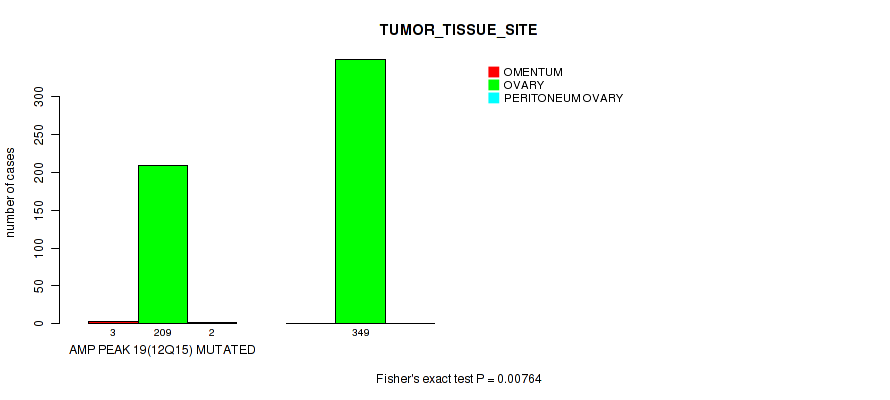 Table S12. Gene #19: 'amp_12q15' versus Clinical Feature #3: 'TUMOR_TISSUE_SITE'