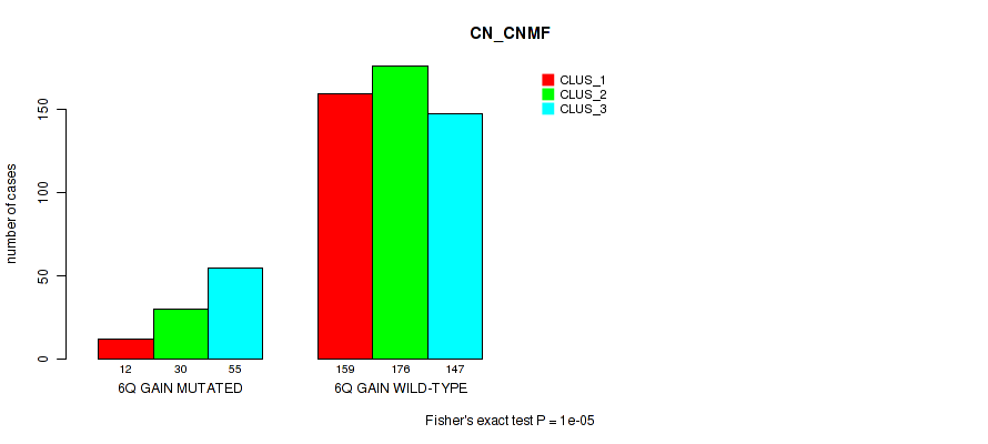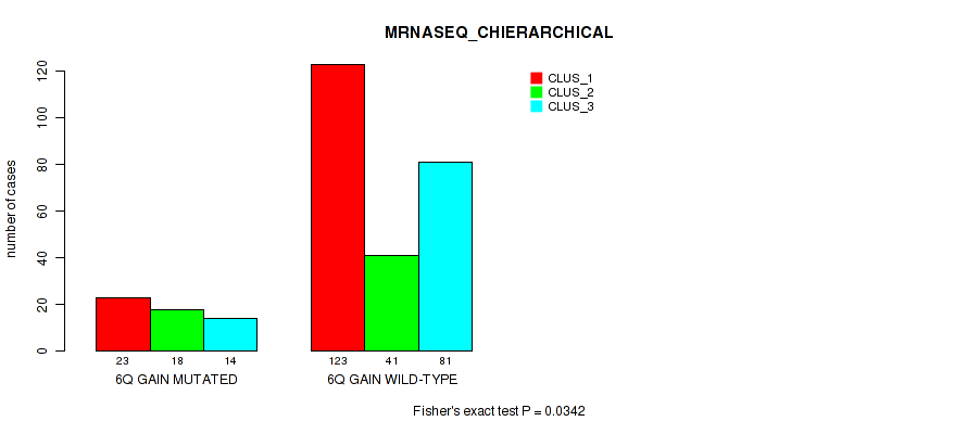 6q gain cnv correlated to 'MIR_CHIERARCHICAL', 'CN_CNMF', 'METHLYATION_CNMF', 'MRNASEQ_CHIERARCHICAL', and 'MIRSEQ_CHIERARCHICAL'.